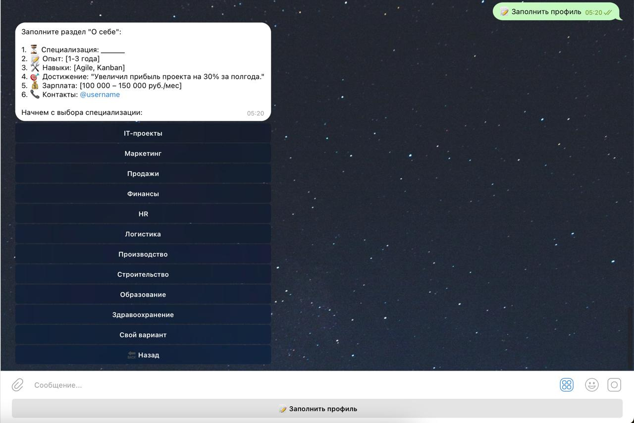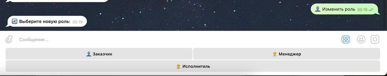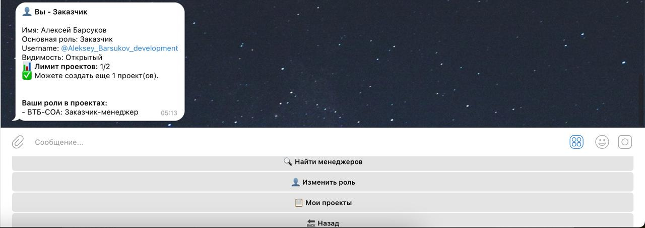 Бот реализует управление проектами через Telegram и поддерживает разные роли: Заказчик, Менеджер, Исполнитель.