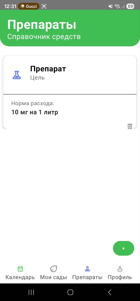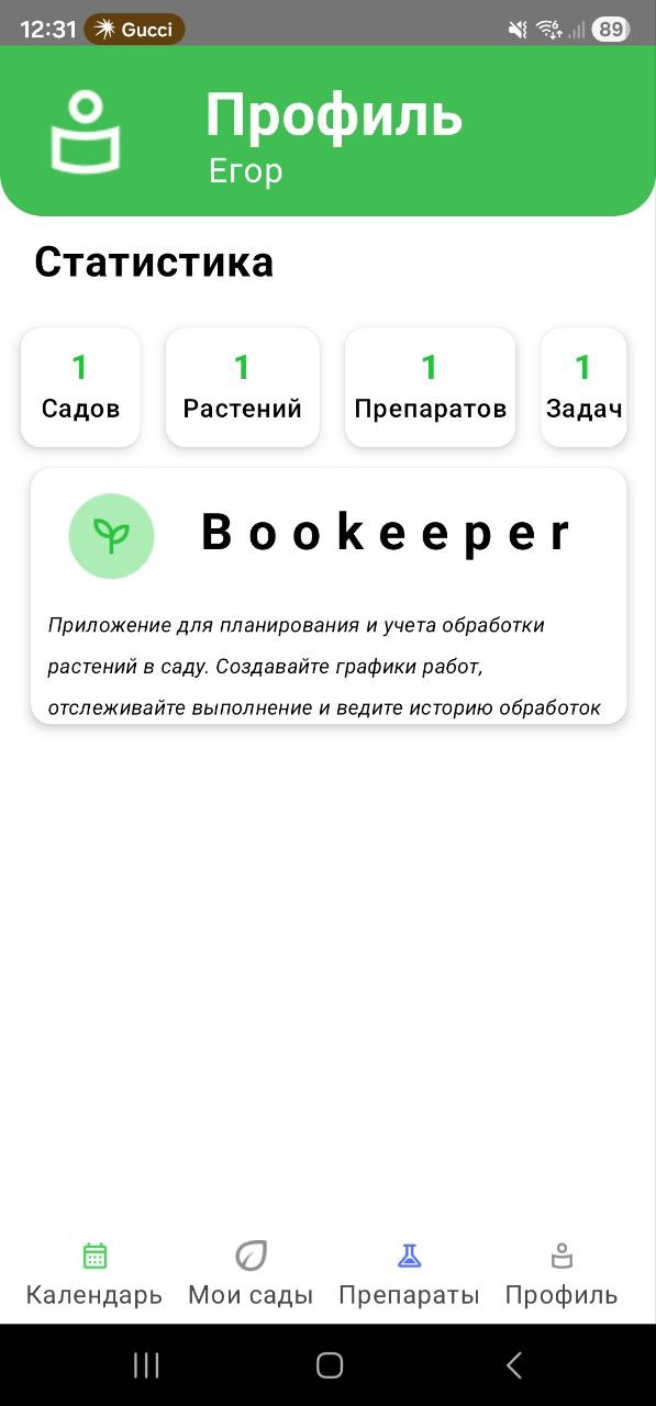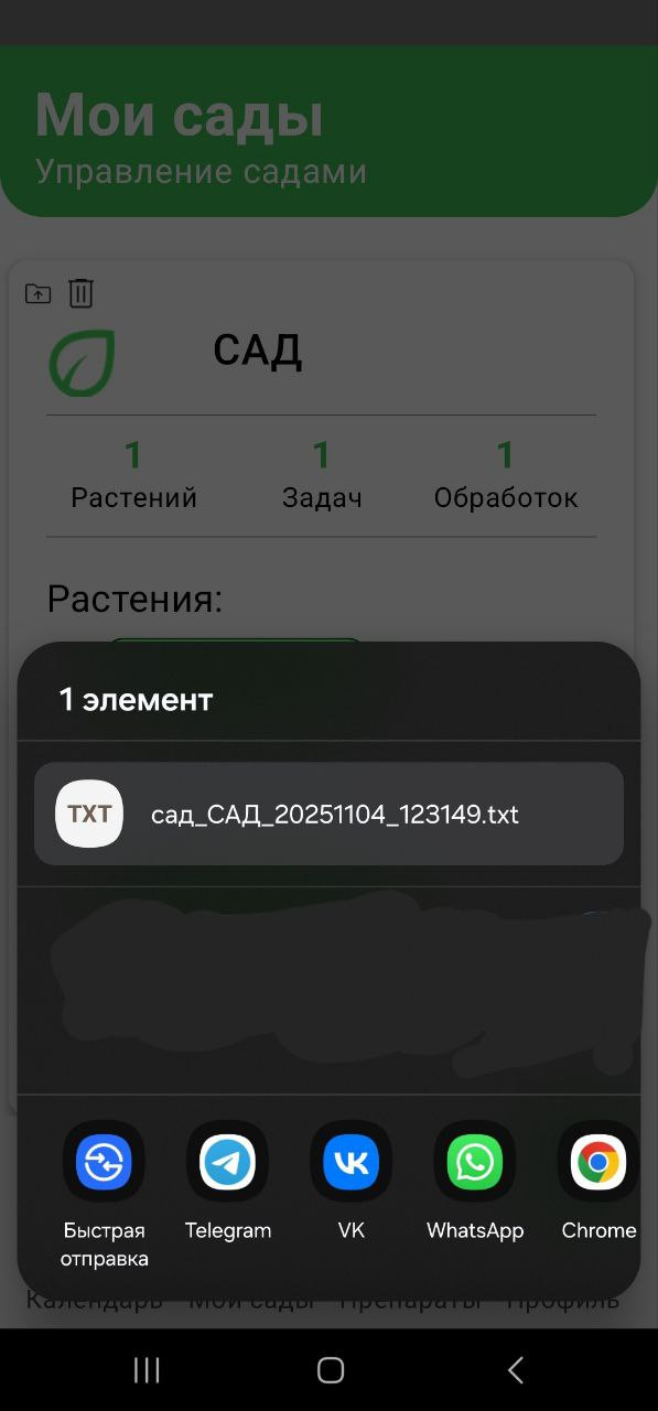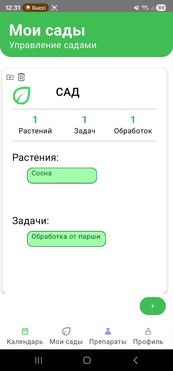 Приложение для учета обработки растений в саду. Представляет собой график работ по обработке каждого растения конкретными препаратами с датами и периодичностью работ. С возможностью добавления негораниченного количества препаратов, садов и растений. Есть авторизация и возможность экспорта сада с растениями, препаратами, задачами, временем и датой экспортирования. В плеймаркете есть лишь один конкурент.