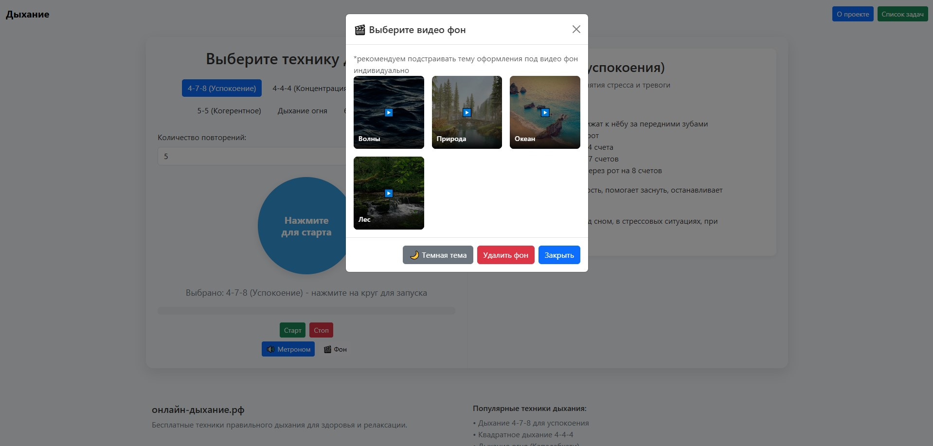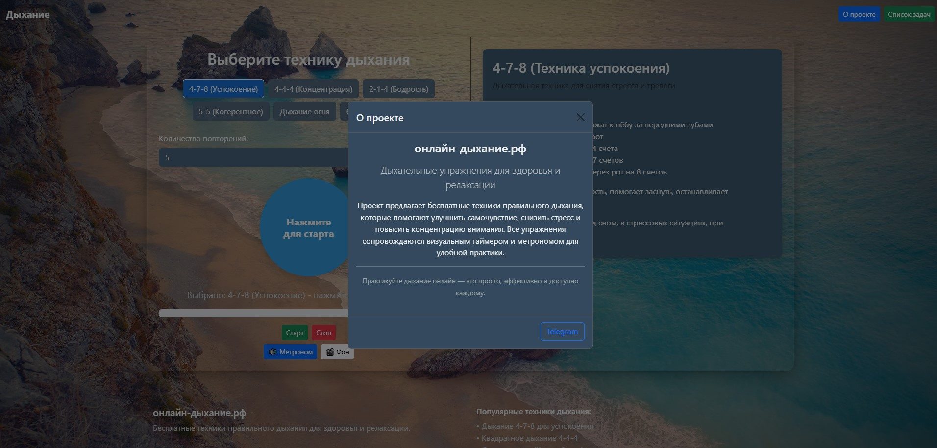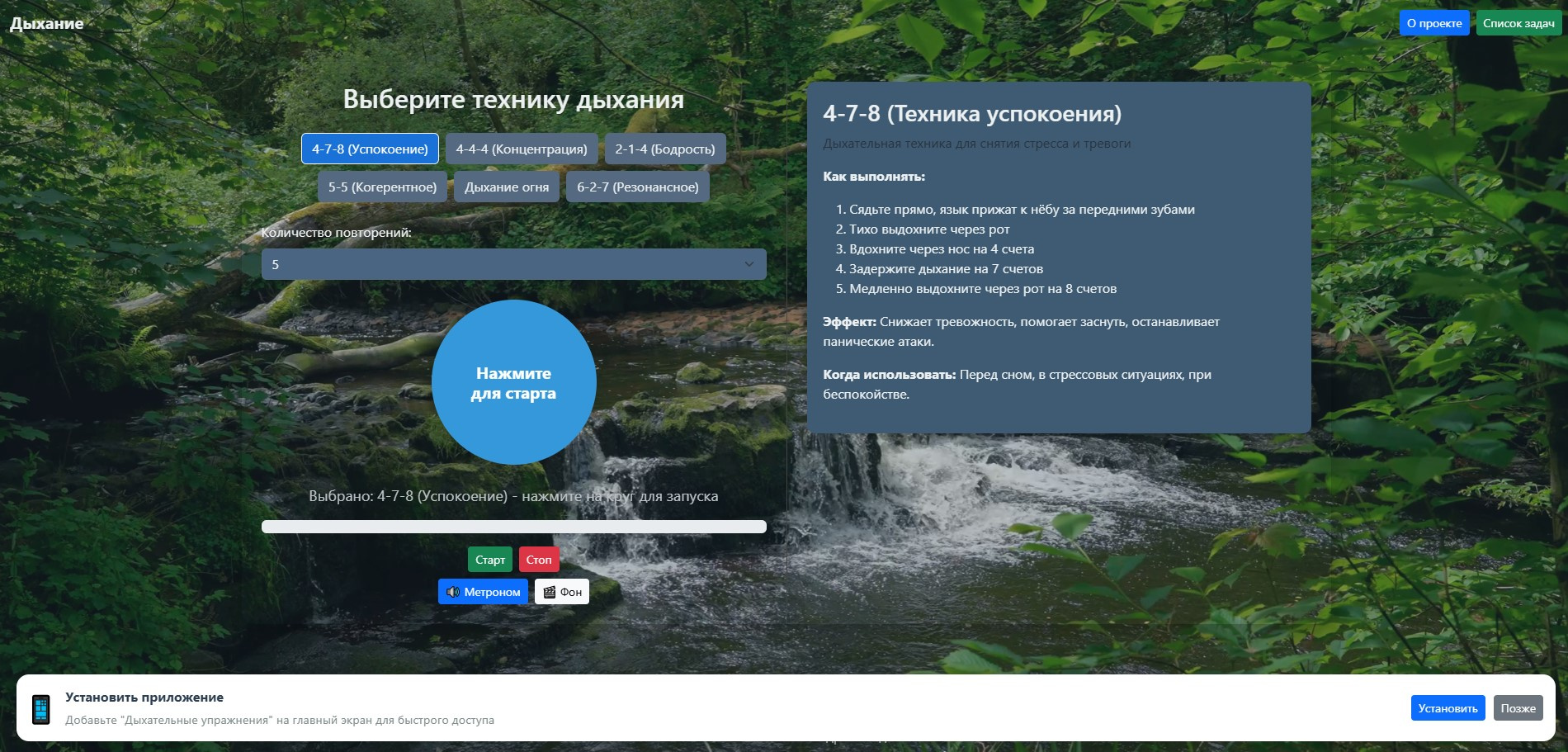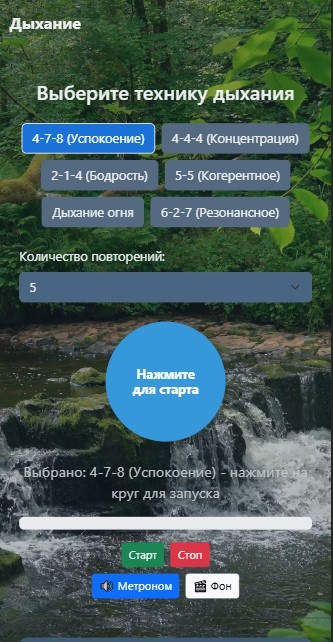 ✅ **PWA-приложение** с 6 техниками дыхания (4-7-8, 4-4-4, 2-1-4, 5-5, Дыхание огня, 6-2-7)