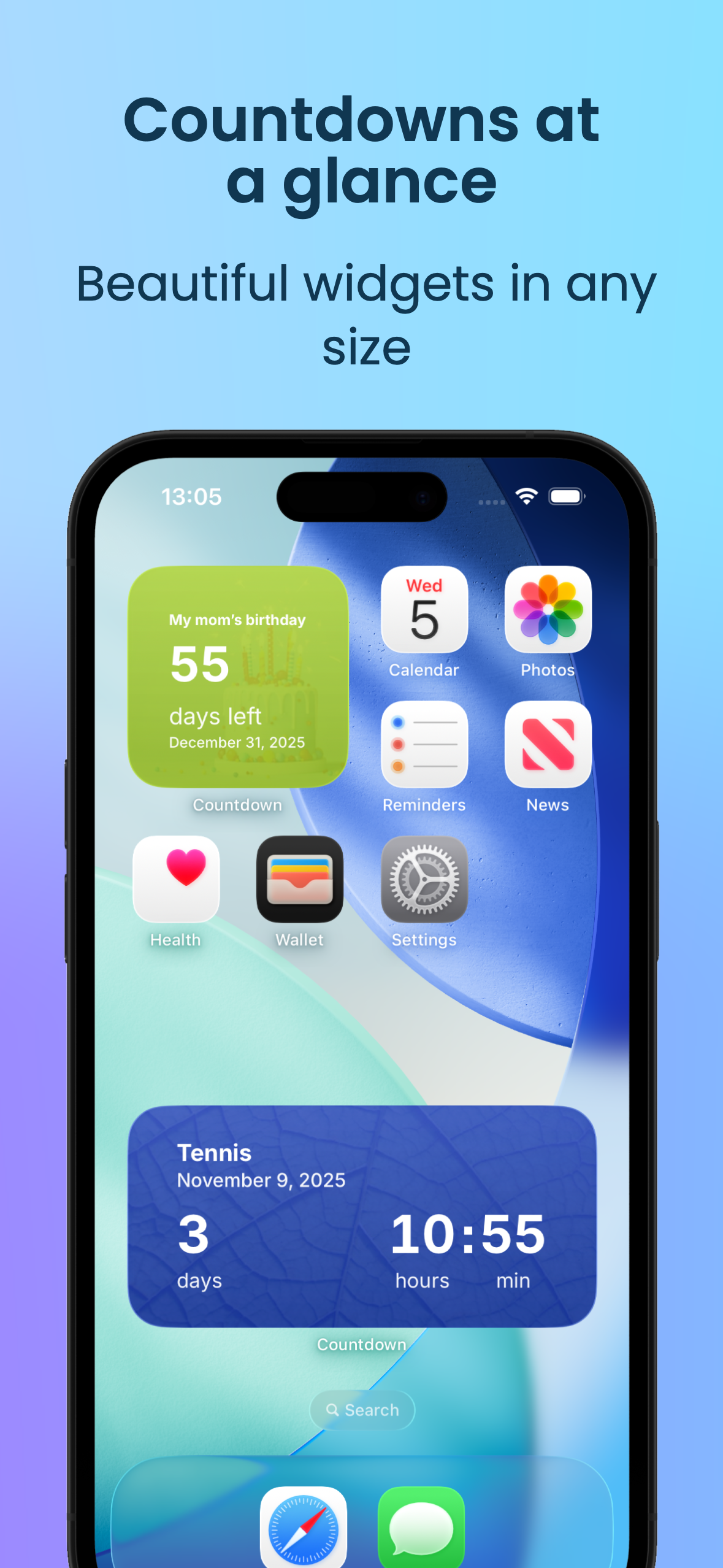 Элегантный интерфейс и продуманная логика делают приложение удобным каждый день — просто откройте экран и сразу видите, сколько осталось до следующего важного момента.