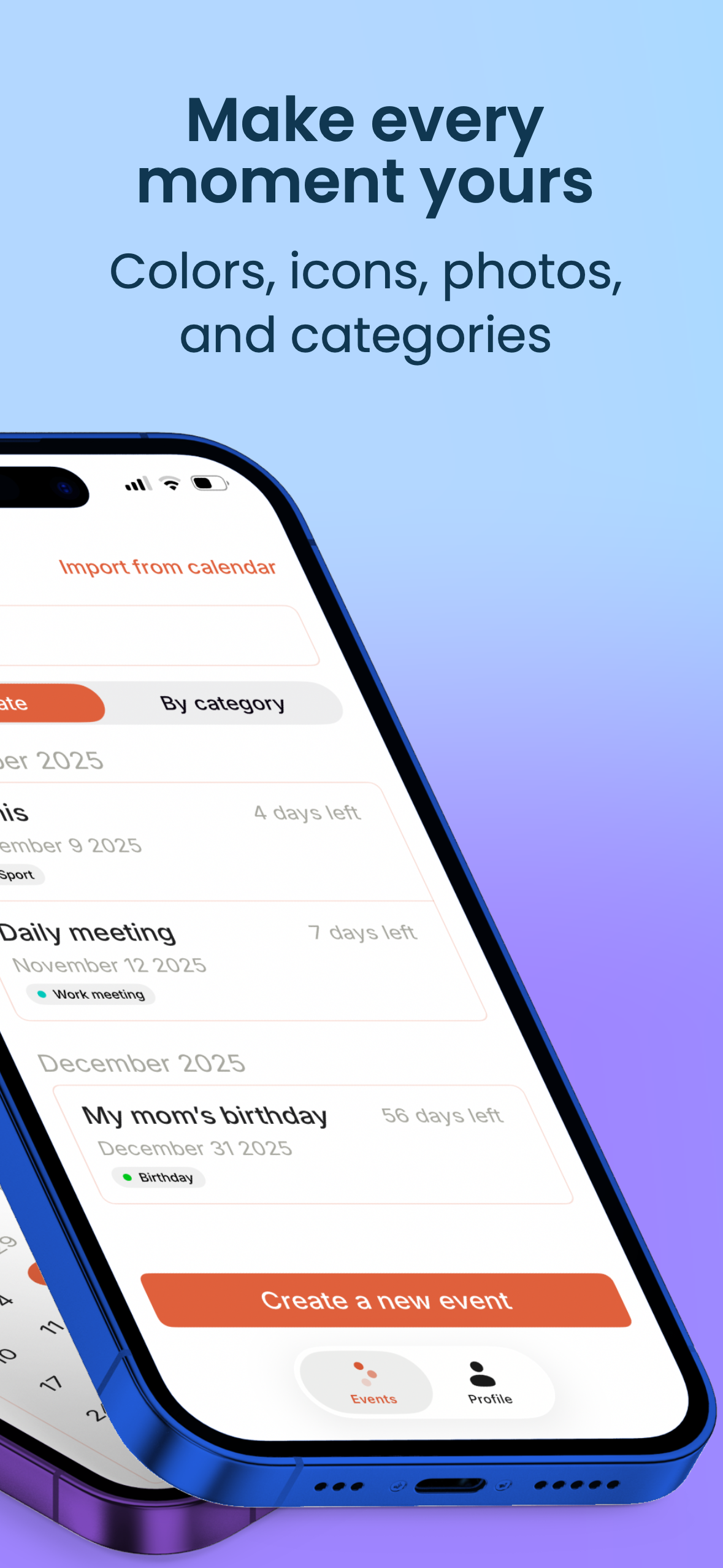 • Настраивайте каждое событие: цвета, иконки, фоновые фото