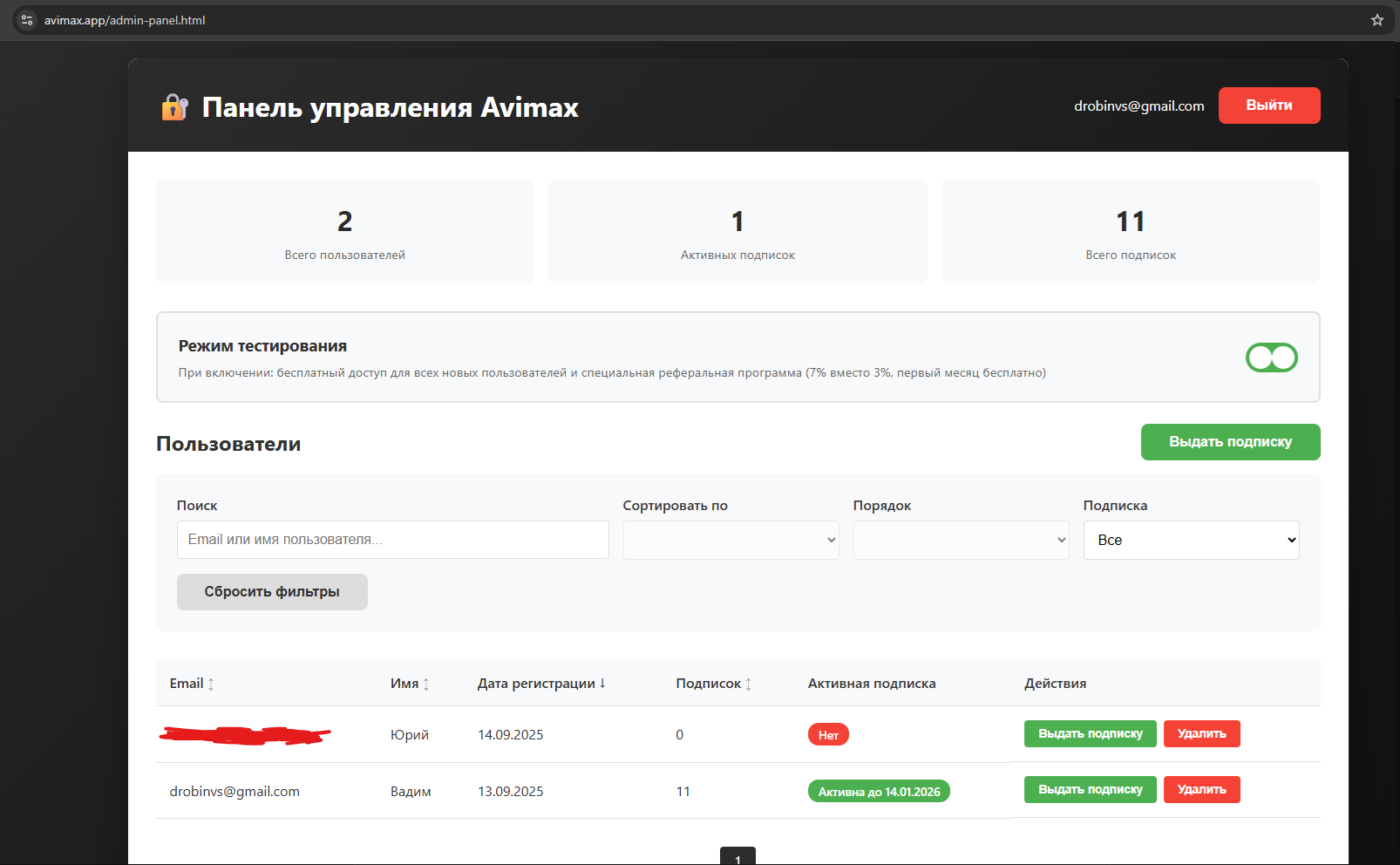 - ✅ Реферальные ссылки формата: `https://avimax.app/register.html?ref={code}`