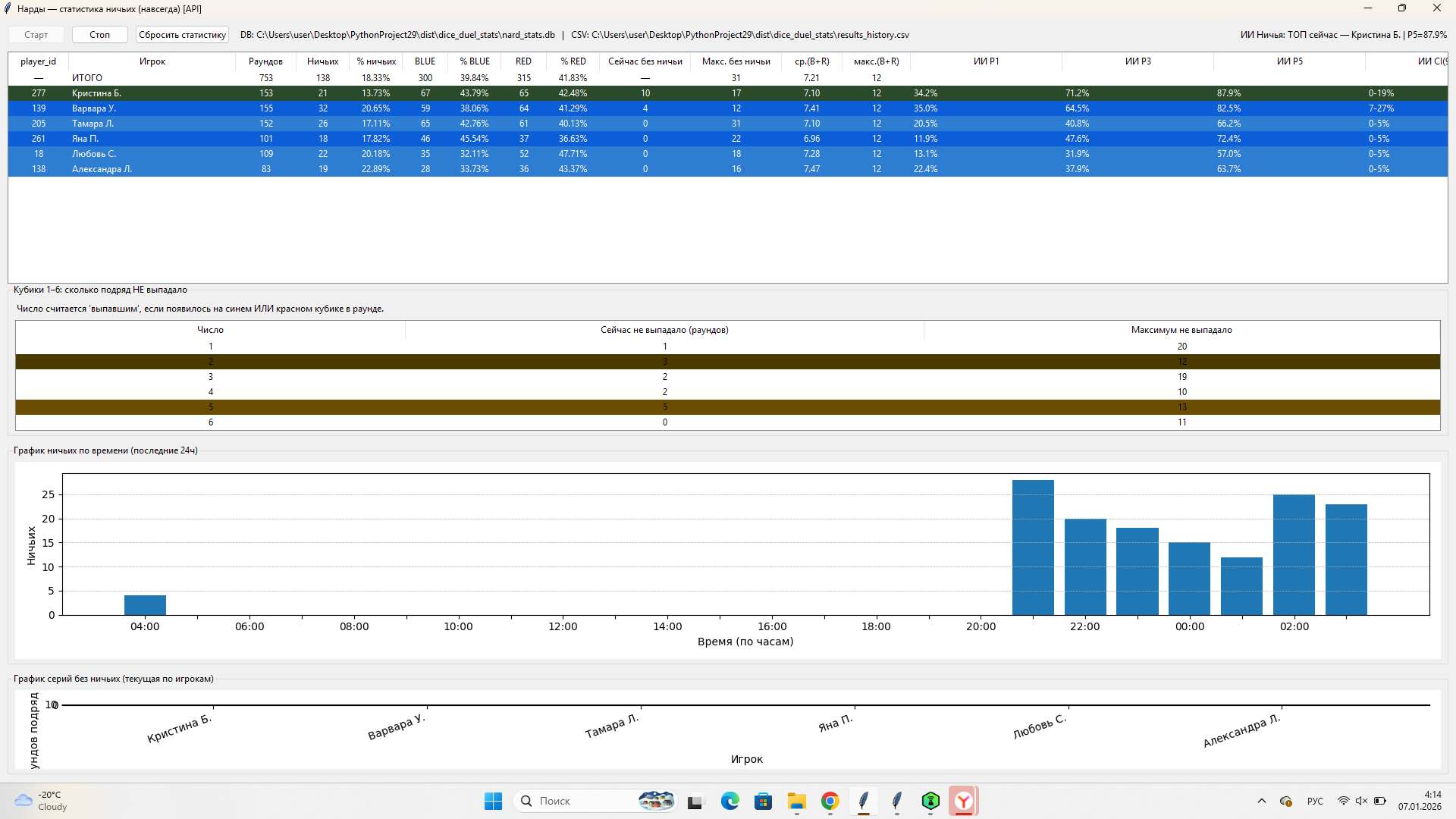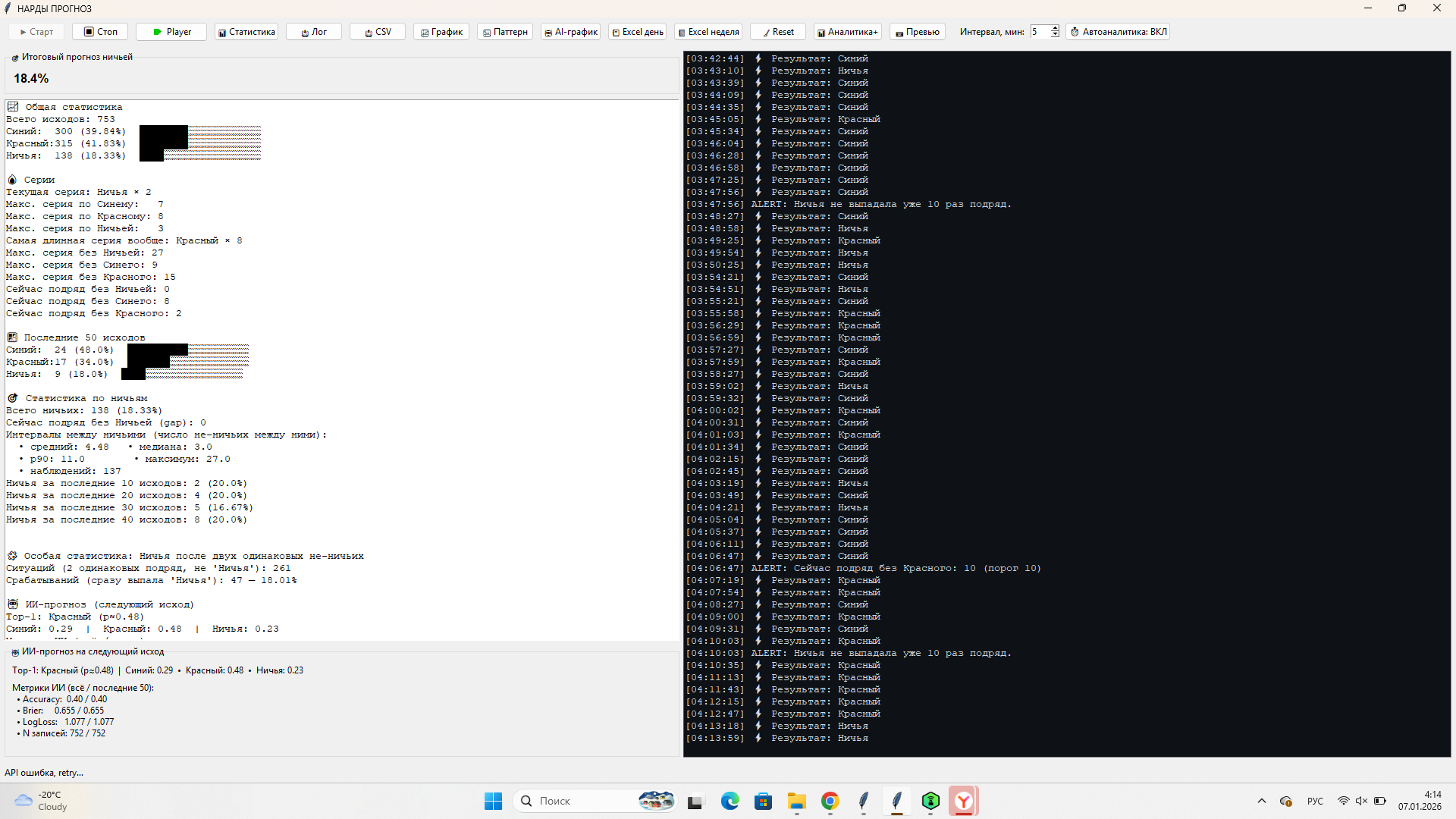 автоматический сбор и обработка данных, аналитика исходов (Синий/Красный/Ничья), отслеживание серий и аномалий, интеллектуальный ИИ-прогноз с самообучением в реальном времени, визуализация статистики и прогнозов, система уведомлений и сигналов, экспорт данных и отчётов; ИИ и аналитика включают вероятностную модель прогнозирования, анализ временных рядов, учёт серий и исторических паттернов, калибровку вероятностей и оценку качества прогнозов по метрикам; визуализация представлена интерактивными графиками, таблицами статистики, обновлением данных в реальном времени и отображением ключевых показателей в GUI; хранение данных осуществляется в локальной базе SQLite с автоматическим сохранением истории и прогнозов и поддержкой работы с большими объёмами данных.