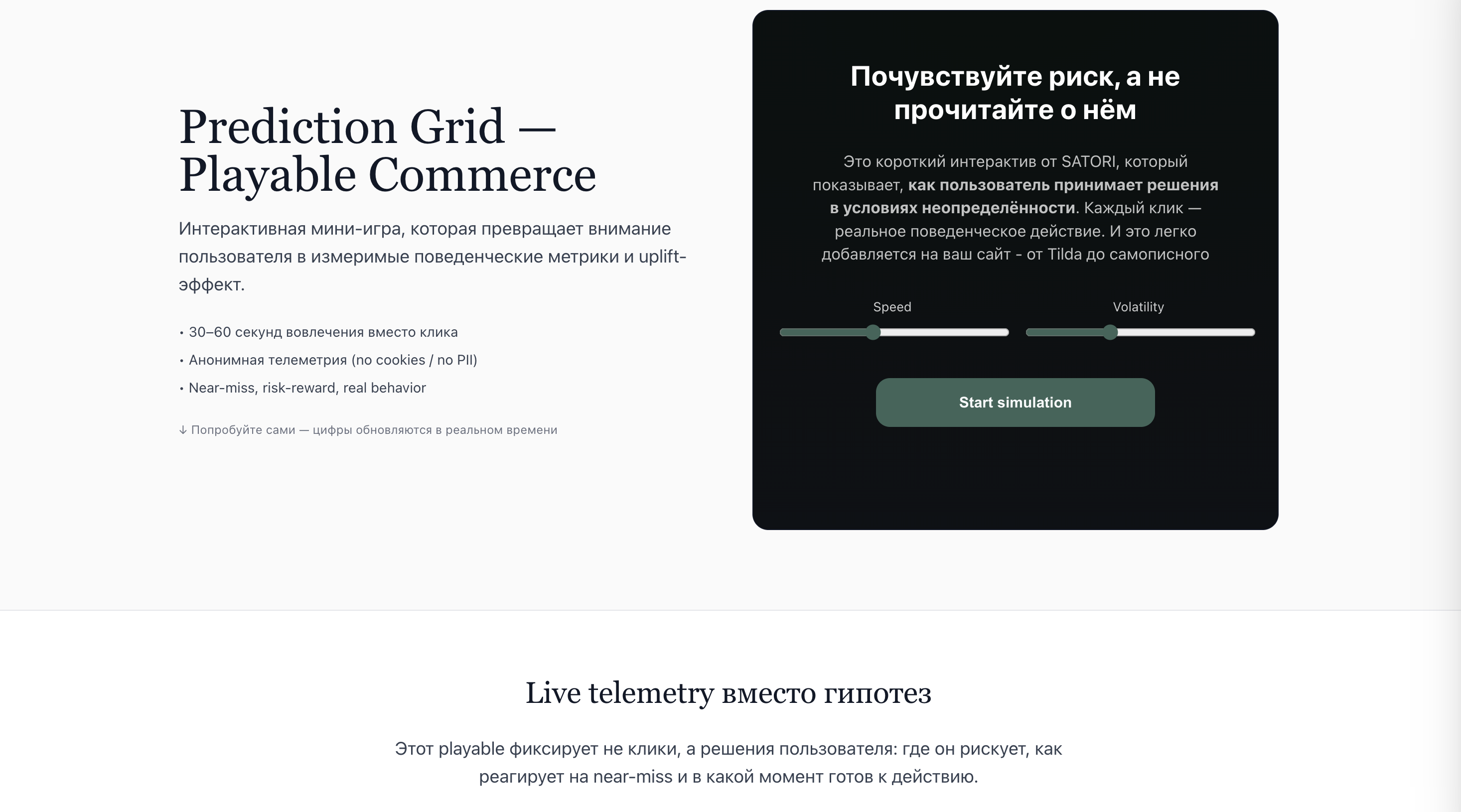 Интерактивная мини-игра, которая превращает внимание пользователя в измеримые поведенческие метрики и uplift-эффект. Это веб-игра в виде одного .js файла, - интегрируется на любой сайт и специальные тильда-блоки.