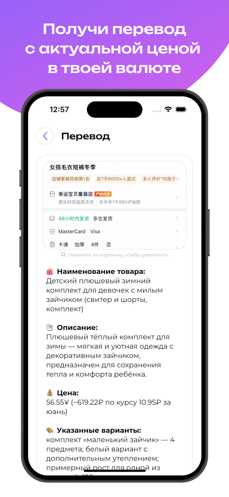 Просто добавьте скриншот товара и приложение распознает текст, переведёт его на русский язык и рассчитает стоимость в рублях.