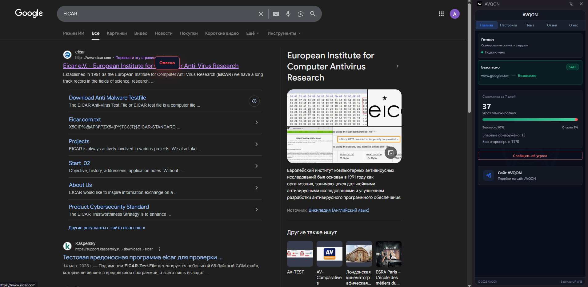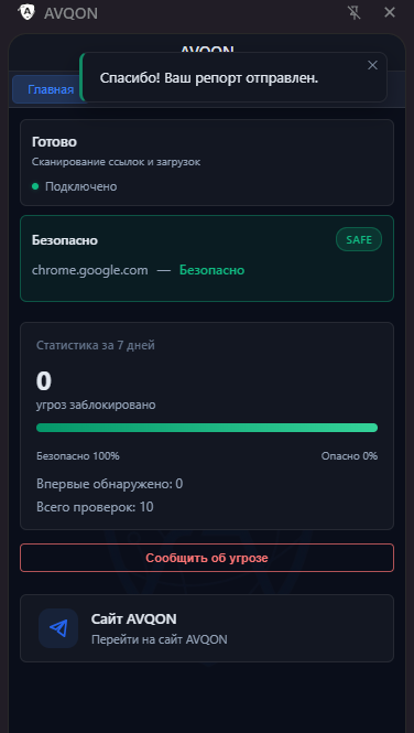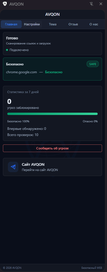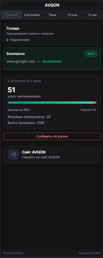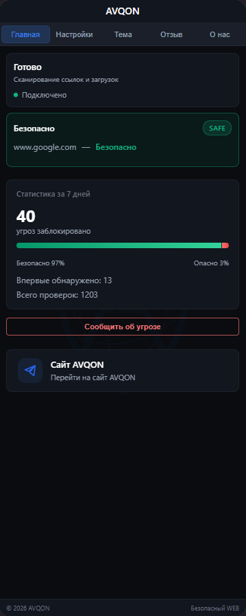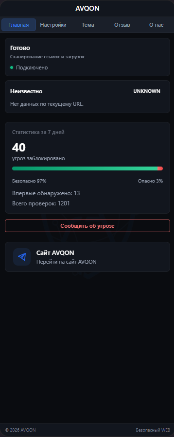 AVQON — расширение для браузера, обеспечивающее защиту от фишинга, вредоносных сайтов и опасных файлов. Работает автоматически в фоновом режиме, не требует от пользователя дополнительных действий.