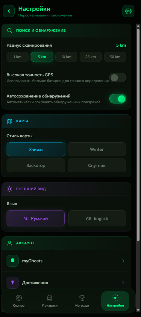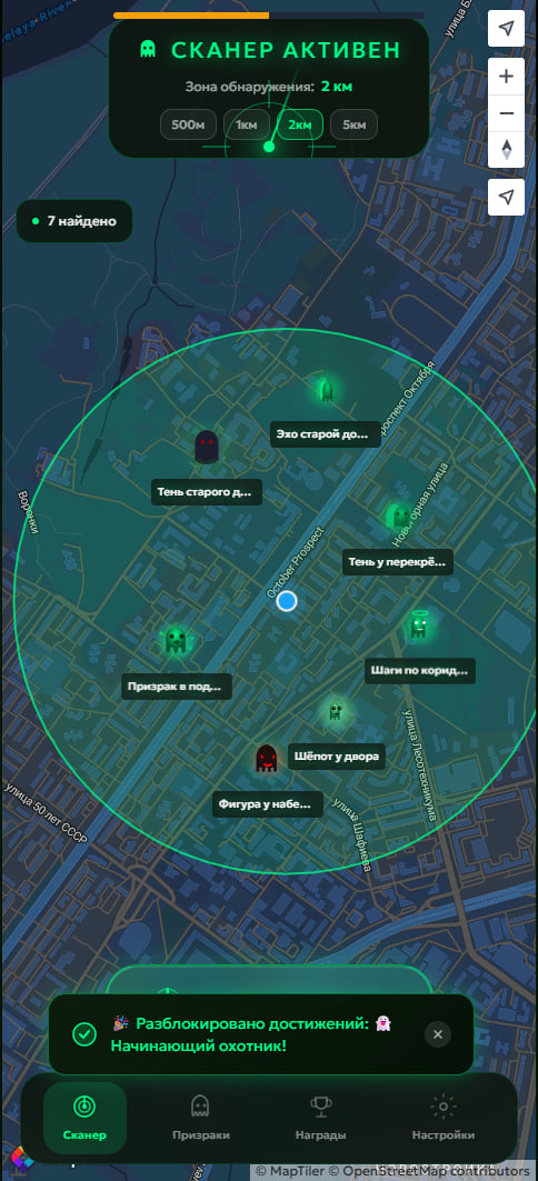 1. Сканирование местности: Интеллектуальный поиск по GPS с настраиваемым радиусом от 1 до 50 км. ИИ ищет призраков для вашей локации, а сам процесс сопровождается атмосферной анимацией и визуальными эффектами.