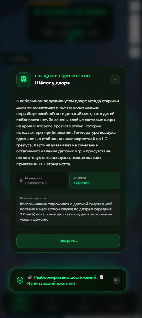 Ghost Hunter — мобильное приложение на базе искусственного интеллекта для поиска паранормальной активности. Анализируя ваши GPS-данные, исторические хроники и местные легенды, приложение с высокой точностью вычисляет места обитания сверхъестественных сущностей.