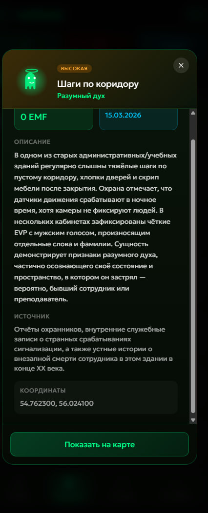 2. Интерактивная карта: Вам доступны кастомные маркеры, пульсация для критически активных зон и 4 стиля отображения (Улицы, Зима, Спутник, Backdrop). Детали о призраках показаны в удобных pop-up окнах.