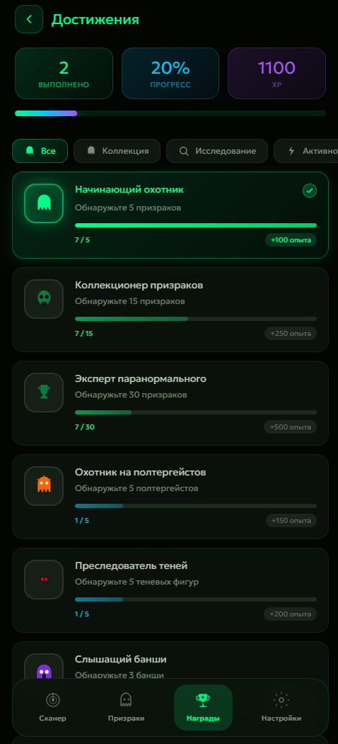 4. Система достижений: Зарабатывайте опыт (XP) в 4 категориях: Коллекция, Исследование, Активность, Энергия. Откройте уникальные достижения с трекингом прогресса.