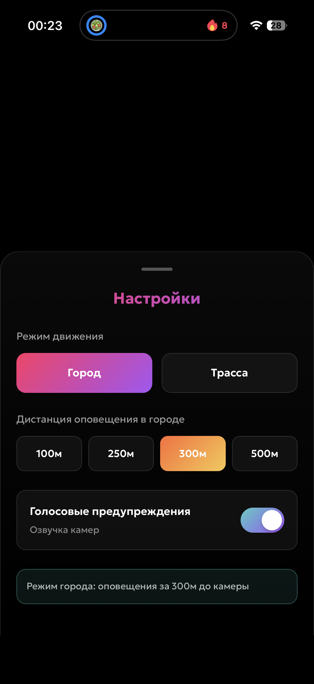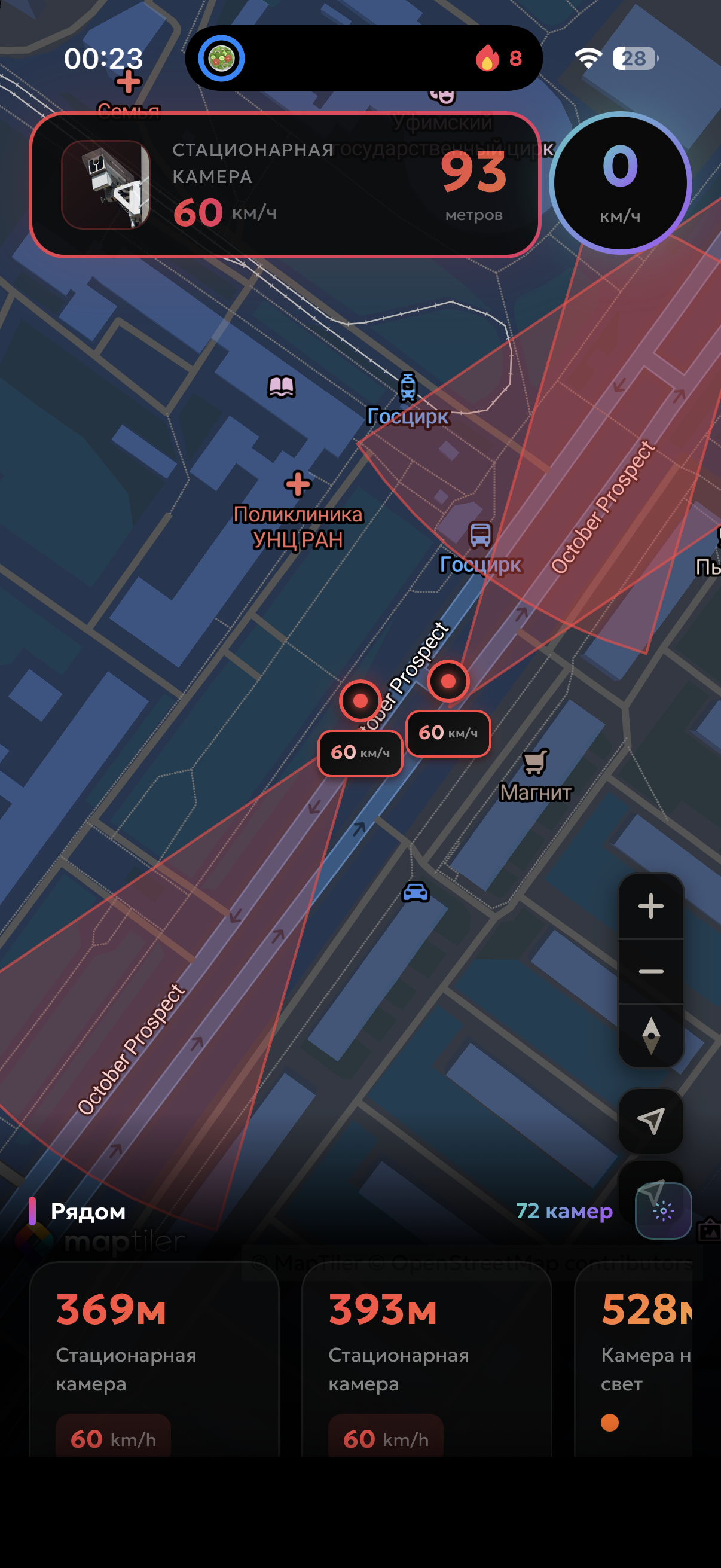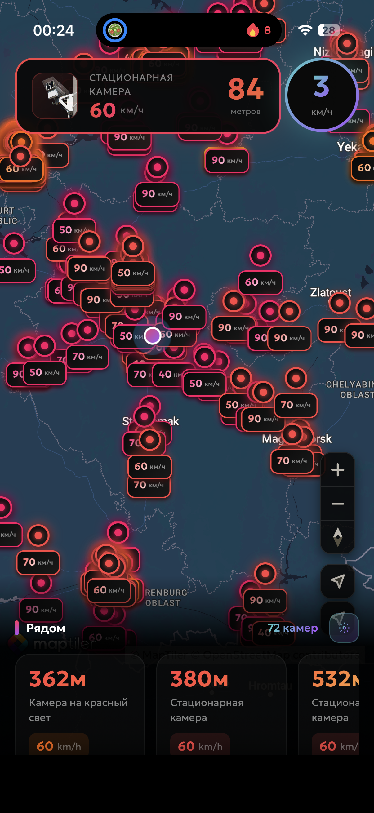 - Показ камер на карте с указанием скорости ограничениям.