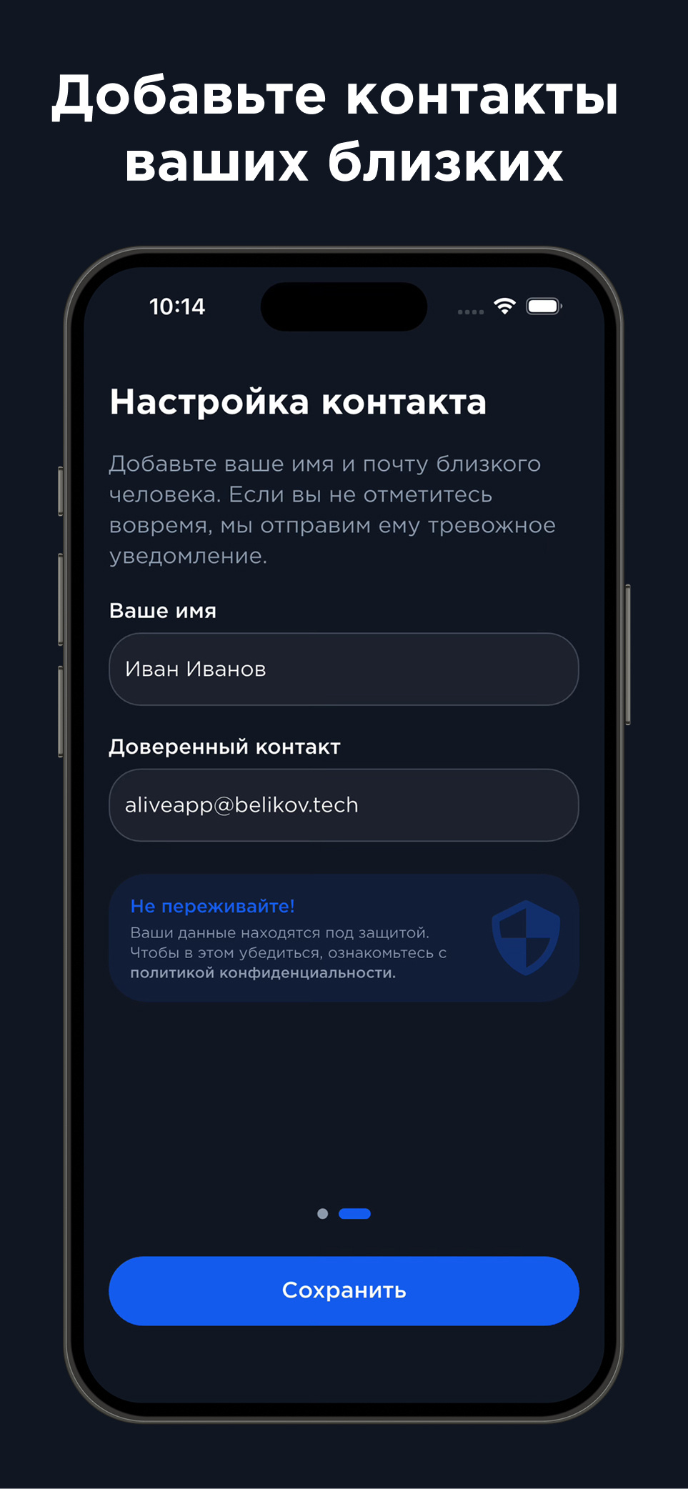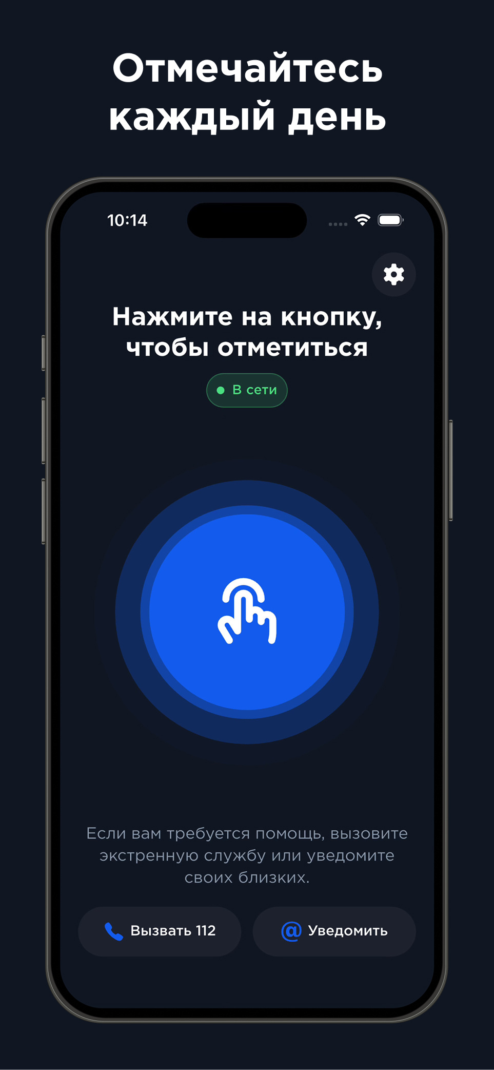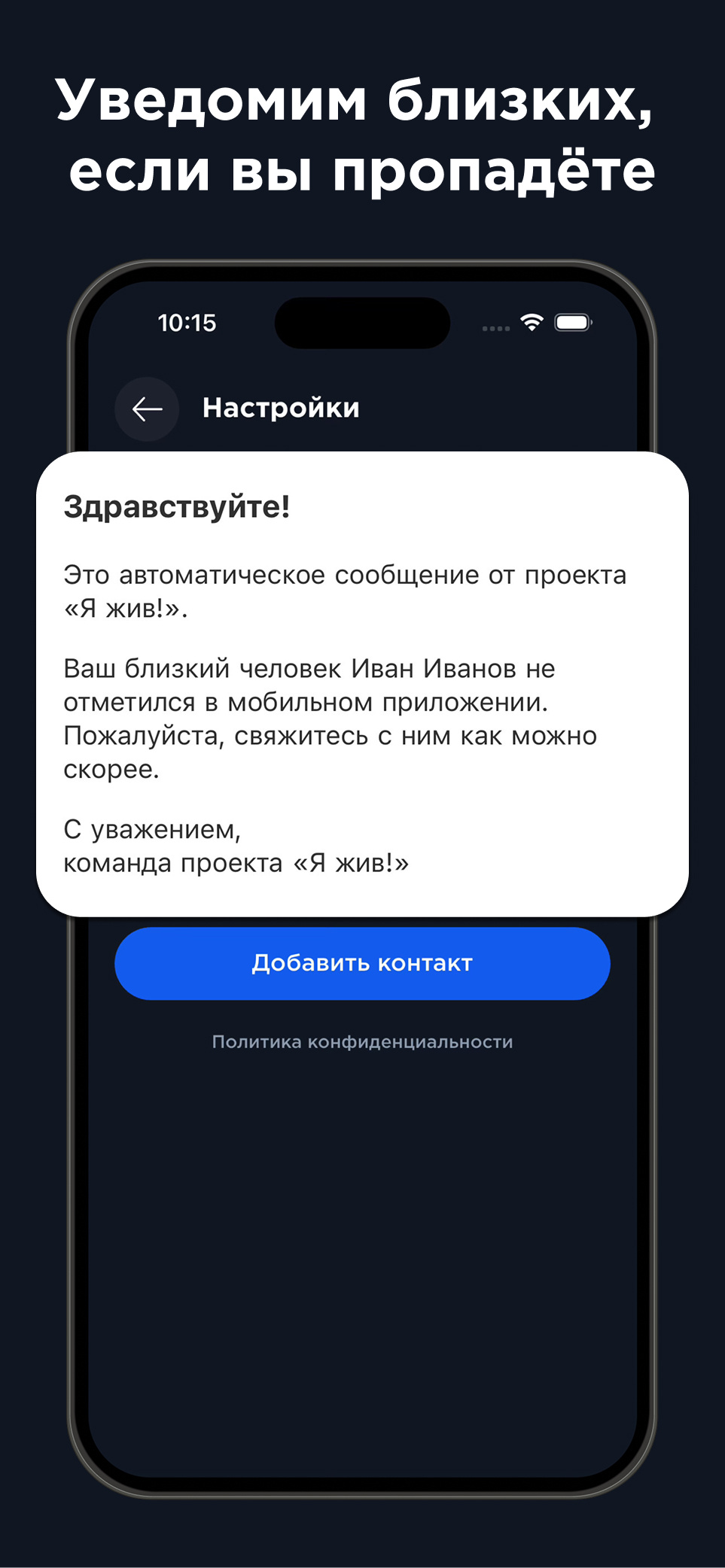«Я жив!» – приложение для ежедневного контроля вашей безопасности. Отмечайтесь каждый день и ваши близкие будут знать, что всё хорошо. Если отметки не будет, они получат тревожное уведомление.