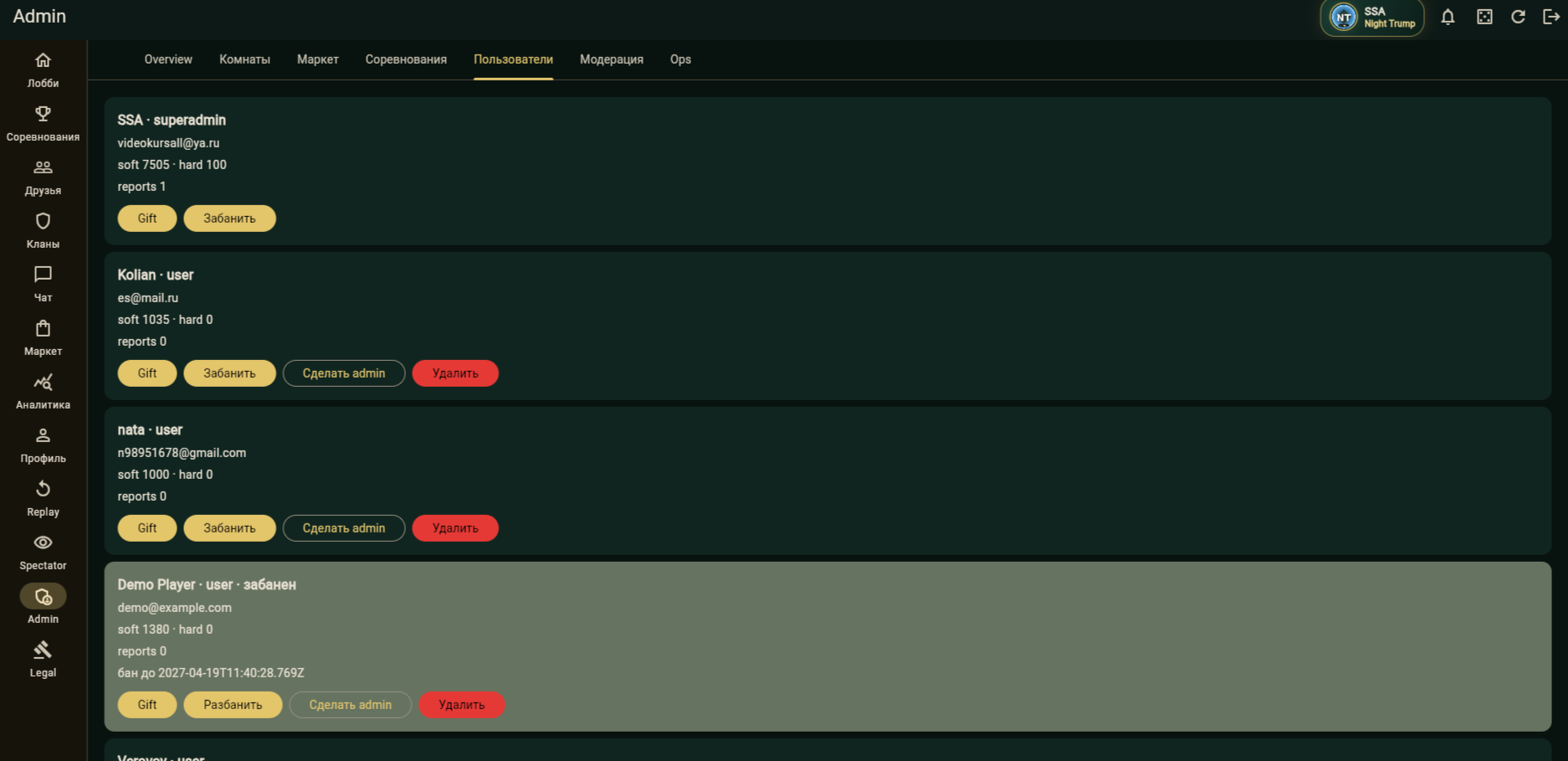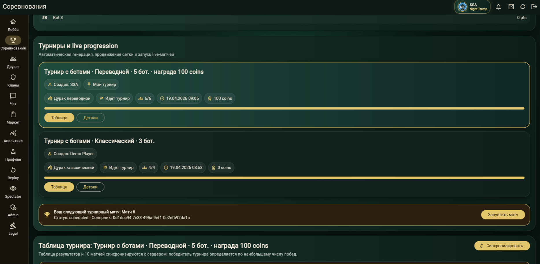 - Admin-панель для управления турнирами, комнатами, матчами, пользователями и аналитикой.