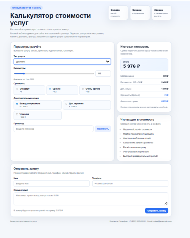 Продаётся готовый исходный код веб-инструмента «Калькулятор стоимости услуг» для сайта или отдельной страницы.