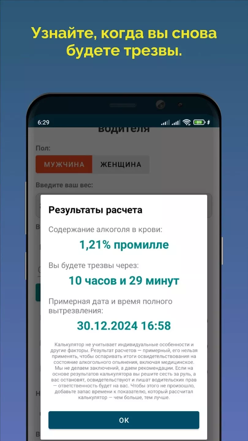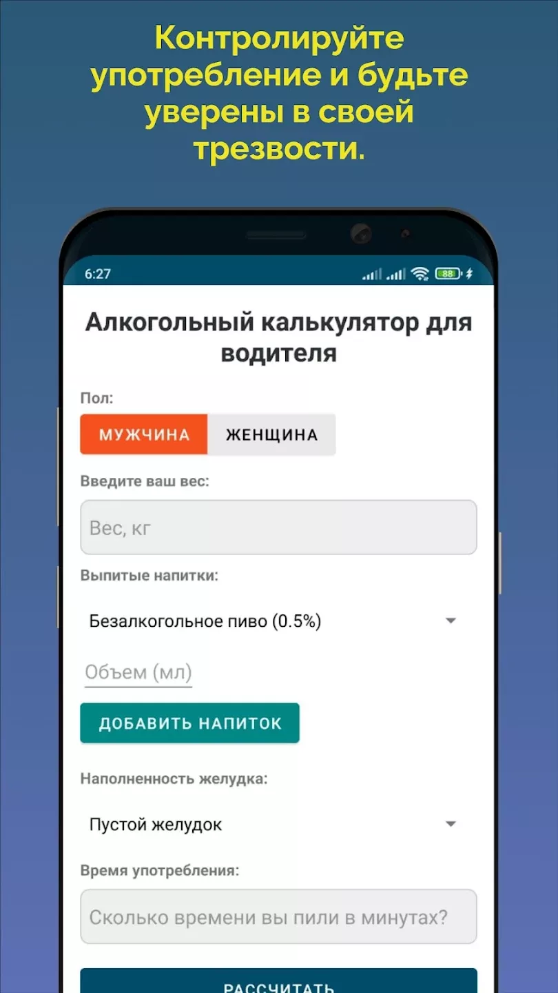 Рабочее Android-приложение для подсчёта содержания алкоголя в крови.