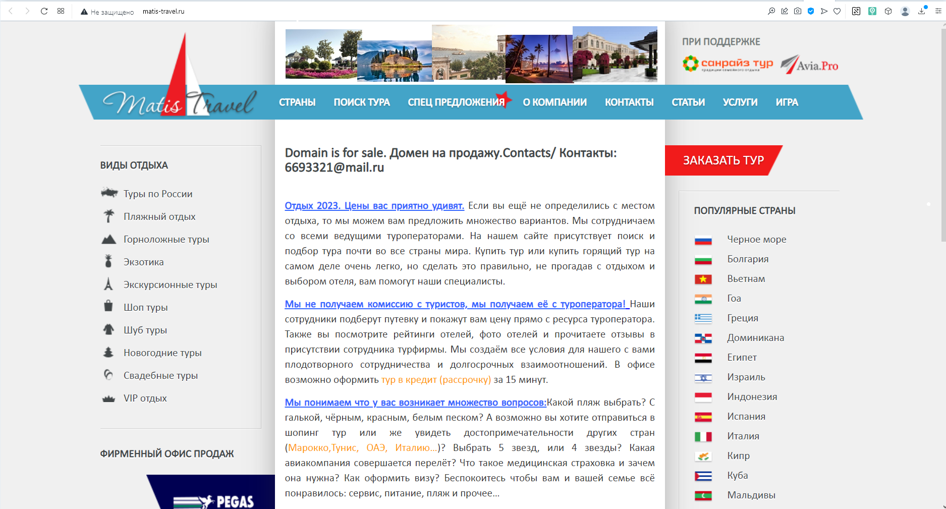 Домен зарегистрирован 13 лет назад. Никаких блокировок или иных отрицательных явлений никогда не было. Домен с хорошим, простым и запоминающимся адресом, представляющим интерес как для турфирм, так и для блогеров, рассказывающих о путешествиях или об искусстве. Есть возможность продать сайт целиком с уникальным по своему содержанию ТЗ на 38 страниц, написанном с целью обновления сайта. Хостинг у сайта закончился, поэтому сайт посмотреть невозможно. Готова заключить договор отчуждения. Самая последняя цена!