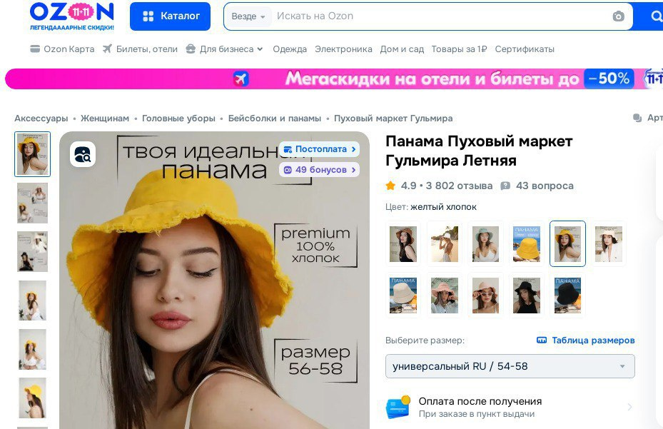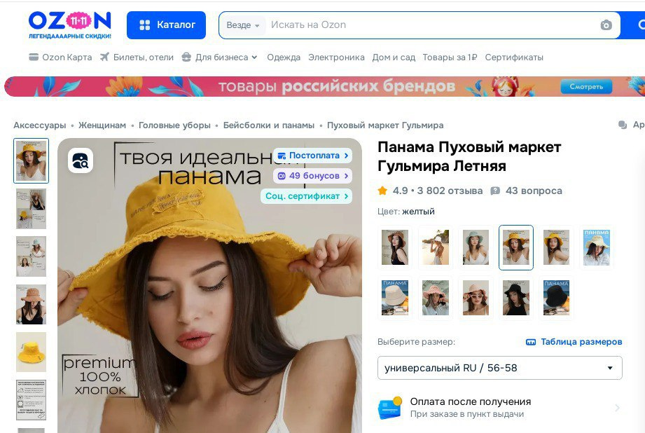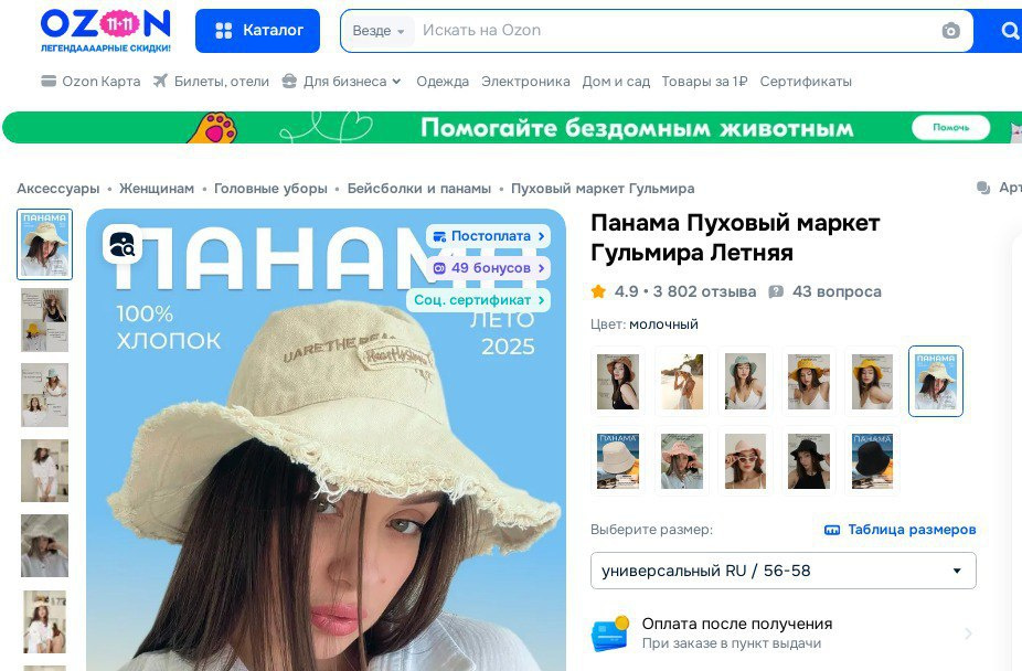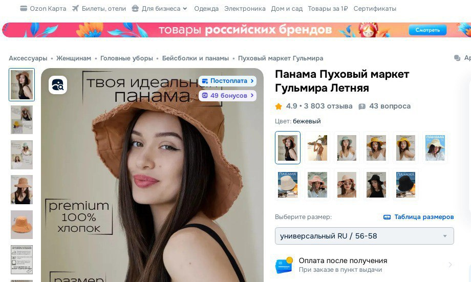 Продаем Карточки товаров на м/ ОЗОН. Тип - Панама летняя женская хлопок. В склейке 15 Артикулов. Высокомаржинальная ниша с быстрым стартом и окупаемостью.