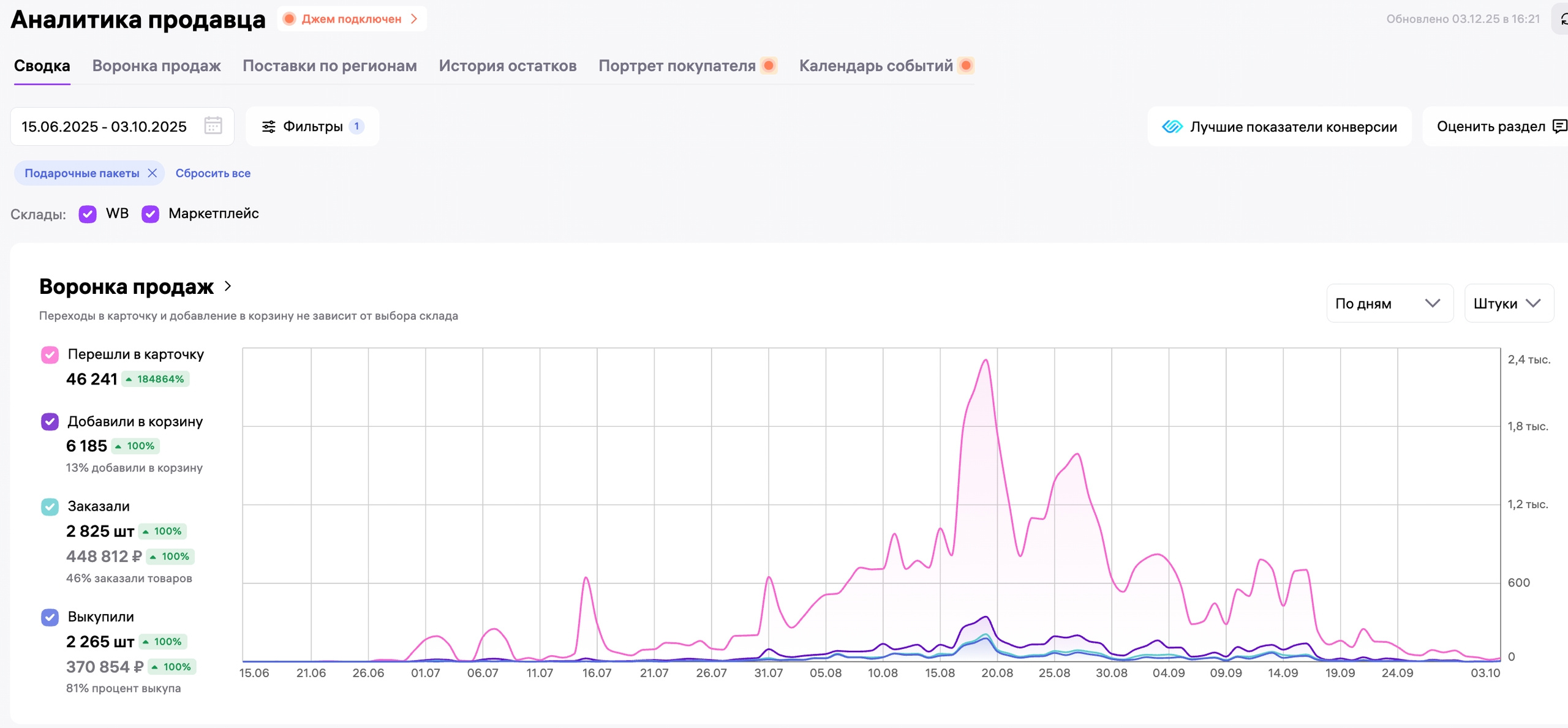 Добрый день! Продаю карточку склейку из 6 карточек. Крафтовые пакеты отличного качества и без нареканий. Остатков на карточках нет более 2х недель, карточки УЖЕ ГОТОВЫ К ПЕРЕНОСУ. Отзывов 235 с фото и видео. Рейтинг 4,9. Также передам контакты поставщика, фулфилмента. Процессы заказа товара и доставки до фф, сборки, доставки до склада вб отлажены. Товар закупался под стратегию как бонус подарок для товара из категории одежда! Но потом стратегию изменили, и из остатков сформировали самостоятельные карточки, пустили в продажу по себесу, соответственно наработали рейтинг и отзывы органически. Тренд у подарочных пакетов как у ниши есть. Прилагаю скрин отзывов на сайте вб для покупателей, график заказов и продаж. В карточки переходили и после того, как остатков уже не было. И до сих пор пишут вопросы когда товар появится в наличии. Цену на telderi указали БЕЗ учета расходов на перенос карточек из кабинета в кабинет самому Wildberries. Тариф вб: перенос одной карточки 5000 рублей. То есть при переносе склейки, вы заплатите вб 6×5000=30.000 рублей.