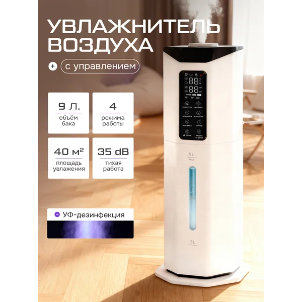 Автоматическая защита при отсутствии воды; Регулировка подачи пара в трех режимах, Интеллектуальное поддержание влажности,таймер; Цветная подсветка, УФ-лампа, Блокировка от детей, Режим сна