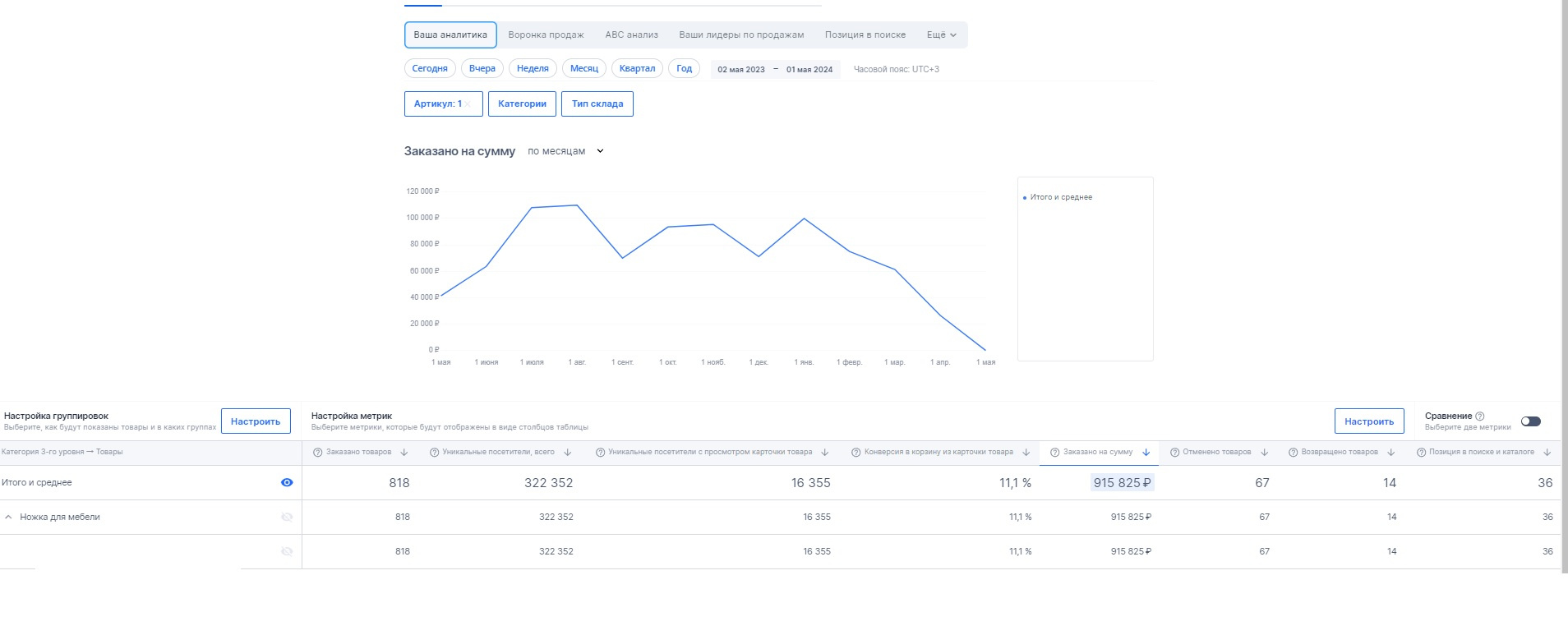 На скрине график за год, снижение в мае, т.к. распродавал остатки. В принципе перестал продавать, только из-за того, что дорогая доставка в мой регион, товар объемный. Идеально подойдет, для жителей центральной части РФ. Т.к. тогда не будет расходов на доставку, за счет чего снизится себестоимость. В комплекте контакты поставщика, поставщик находится в РФ, что очень сильно упрощает расчеты и вообще весь процесс закупки товаров. Тематика: запчасти мебельные. Себестоимость вместе с упаковкой 600 рублей, стоимость продажи 1590. Средняя прибыль в месяц 30-40 тыс. рублей. Потенциал в районе 200 т.р. 283 отзывов, общая оценка карточки 4.9, товар очень качественный. Карточка в топ 3 поиска по ключевым запросам. Вы приобретаете не просто карточку товара, а бизнес модель, которая работает и приносит хороший доход с небольшими вложениями. Настраивать уже ничего не потребуется, всё настроено и работает.