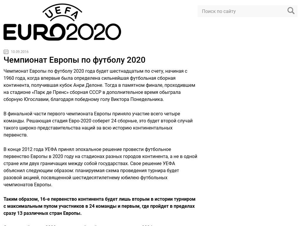 Чемпионат Европы по футболу 2020. ЧЕ2020. Перспективный сайт, с не менее перспективным доменом. Сайт полностью готов для наполнения текстами и доп. функционалом.