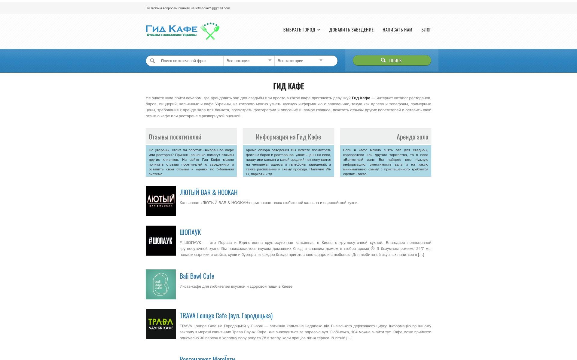 Сайт с отзывами и обзорами ресторанов, баров, кальянных в Украине. Сайт хорошо ищется по нескольким тысячам запросов, украинский поисковый трафик. До карантина была намного выше посещаемость, продавались вип-места. Сейчас начал восстанавливаться траф. Сейчас висит реклама Адсенс, несколько раз продавал приоритетное размещение заведений в ТОПе (есть такая возможность). При этом сам рассылки ни какие не делал, ко мне обращались сами заведения, которые добавлялись на сайт. Есть специальная форма. Все тексты уникальные, фотографии тоже старался уникализировать, многие мои. Планировал сделать рассылку по продаже приоритетных мест позже, когда будет больше заведений, но сейчас нет времени на их добавление.Больше всего трафика дают кальянные, так что старался добавлять их в первую очередь. Сейчас открыты города Киев, Львов и Запорожье, но можно открыть и другие, главное чтобы было кому писать обзоры заведений.