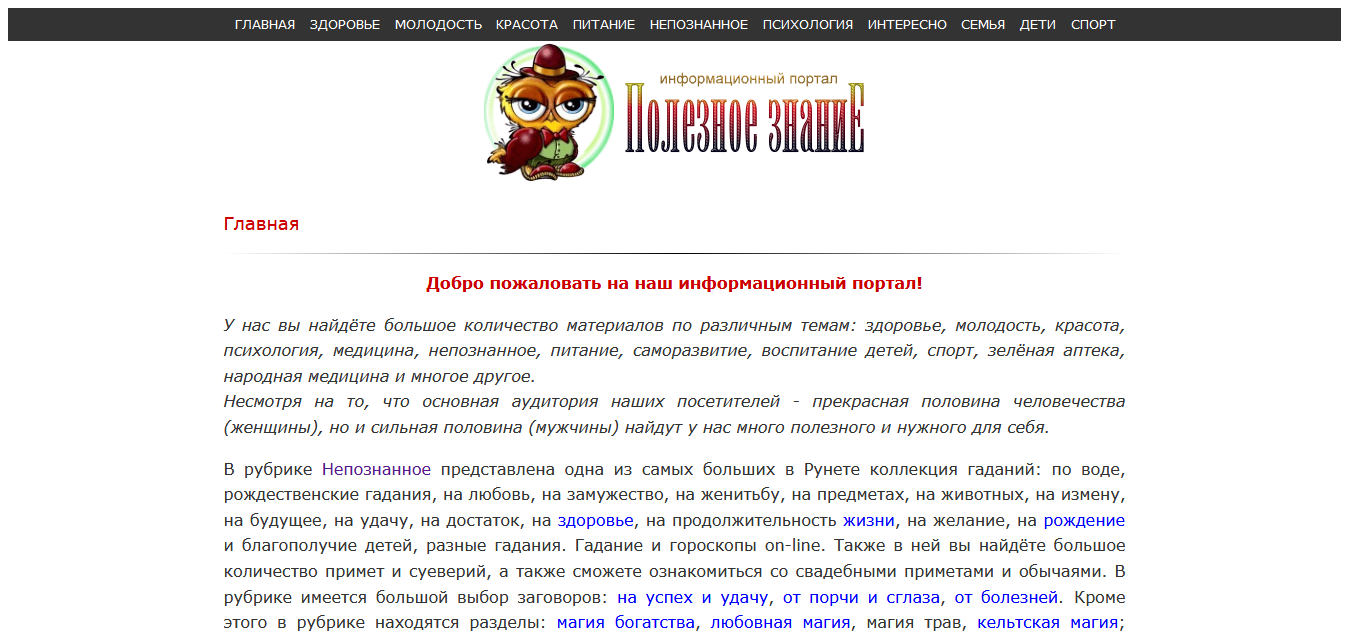Сайт с набором статей на различные темы: спорт, психология, дети, молодость, здоровье, красота. Рассчитан на универсальную категорию посетителей, с большим процентом женской аудитории. На сайте около 4.000 статей!!! Идеальный вариант под биржи ссылок. Мог бы зарабатывать на них несколько тысяч рублей в месяц, но не делаю этого, т.к. хочу передать покупателю не заспамленный ресурс.