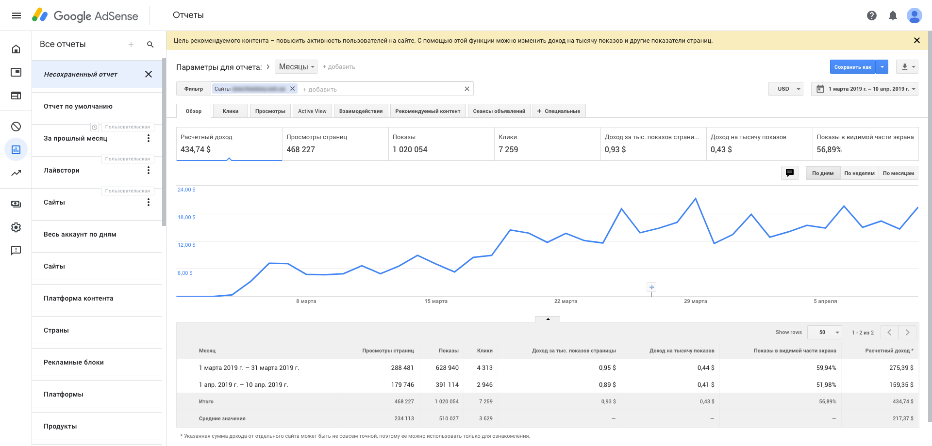 Добавил скриншоты дохода за март и несколько дней апреля.
