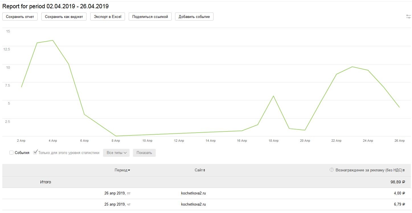 Недавно разместил на сайте РСЯ. В итоге со 2.04 по 26.04 вышло 98 руб. при этом, так как сайт не работал 9 дней выходит, что за полмесяца вышло 98 руб. Примерный доход в месяц 196 руб.