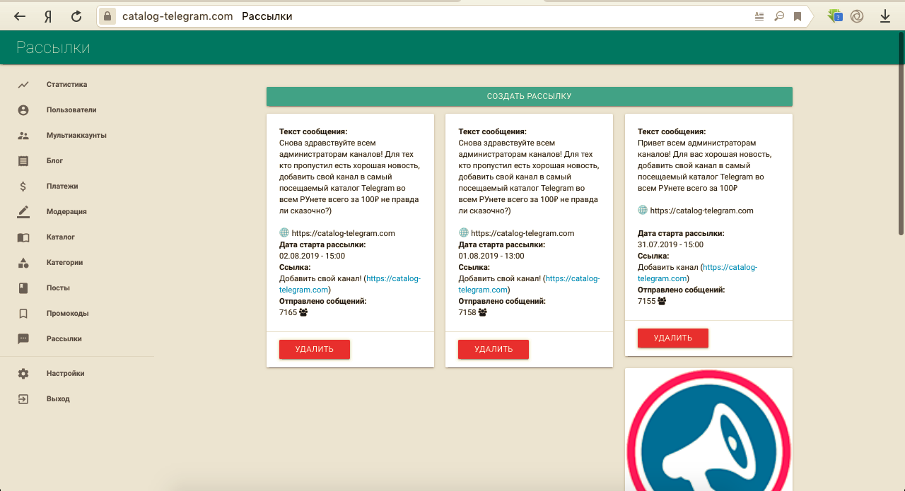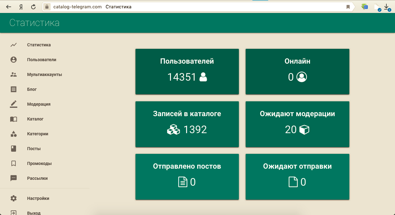 Каталог служит для привлечение первого трафика на свеже созданный канал/бот/чат в телеграм, как правило все кто только создал канал идут в яндекс искать источники для трафика в tg и первым делом попадают в каталоги, данный каталог создан одним из первых и уверенно занял первую позицию по ключемову запросу, сайт сделан на самописном движке в нем все самое необходимое для автоматизированной работы скрипта, автоматическое размещение канала после оплаты пользователя, все цены на размещение репоста в канал и закрепление в топе выставляются на усмотрение будущего владельца, автоматический прием платежей через Payeer и Qiwi естественно через прямой API платежных агрегаторов. Ссылки не продавались.