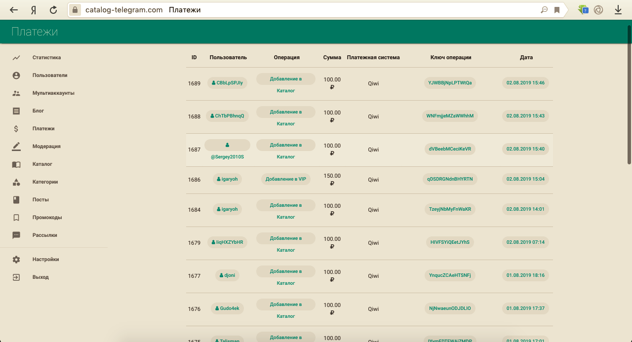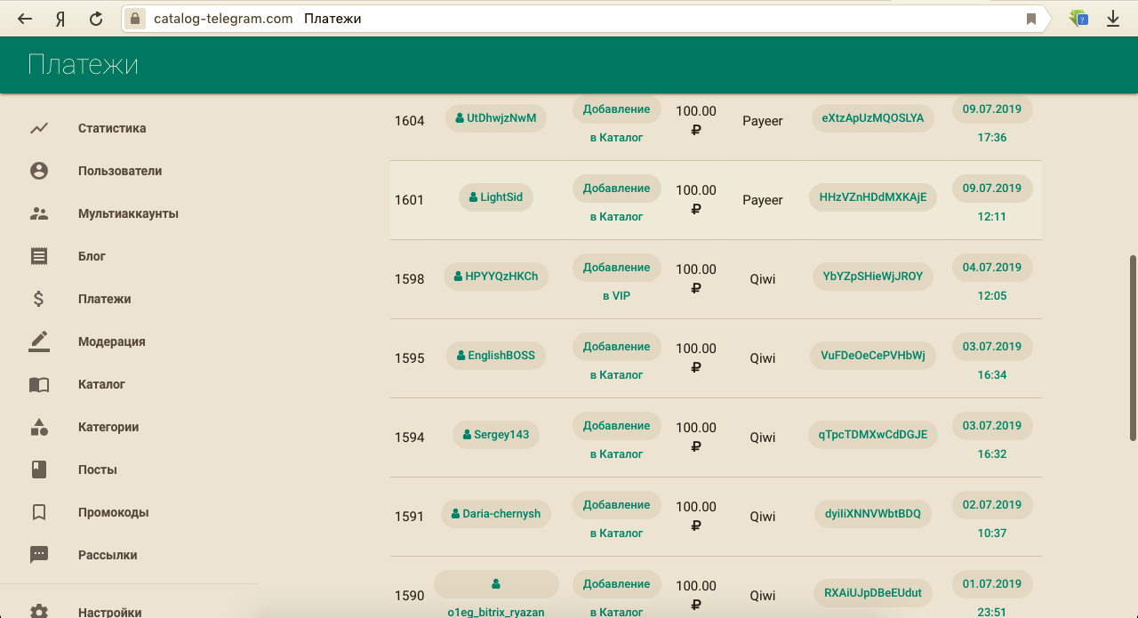 31.07.2019 -- Добавлен новый telegram bot - телеграм чат ( поддержка кнопка на сайте формирует запрос уведомление приходит к админу, он уже ведет клиента за руку что нужно делать что бы давить канал / чат / бота на сайт, и продает рекламные допы - рассылку по боту авторизации каталога, баннеры на сайте каталога). Тем самым увеличены продажи в 5-7 раз. (добавления в каталог ценой в 100р единовременно, закрепление канала 100р и выделение цветом 50р)