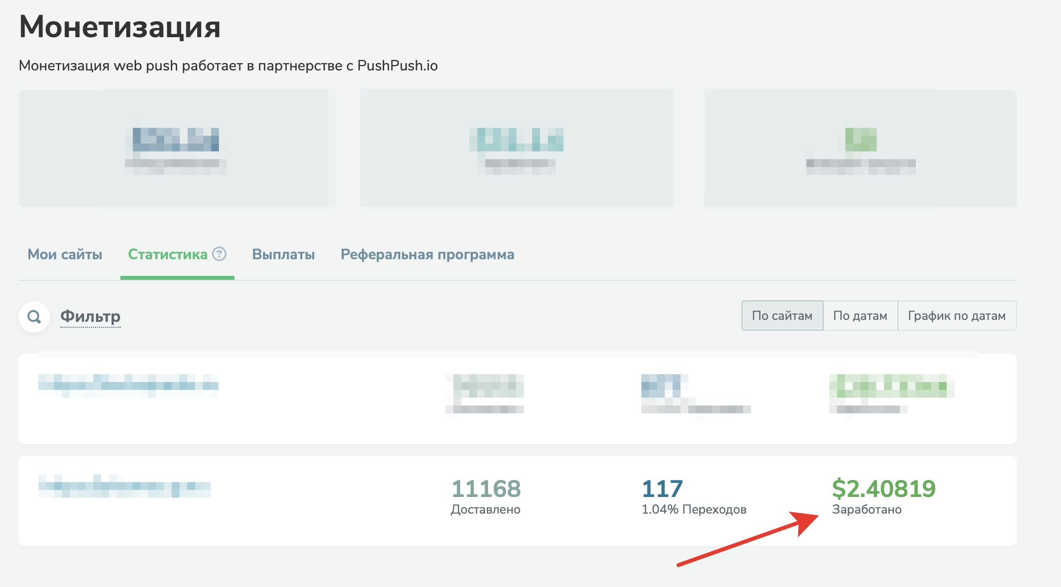 * Сайт собирает подписчиков на push-увемодления в сервисе sendpulse.com. Сейчас в базе 5,6 тыс. активных подписчиков. 6 июня включена монетизация базы, до этого был только сбор. За это время запаботано $2,4 (смотрите в скриншотах). Этот доход я никак не учитываю, будет бонусом новому владельцу.