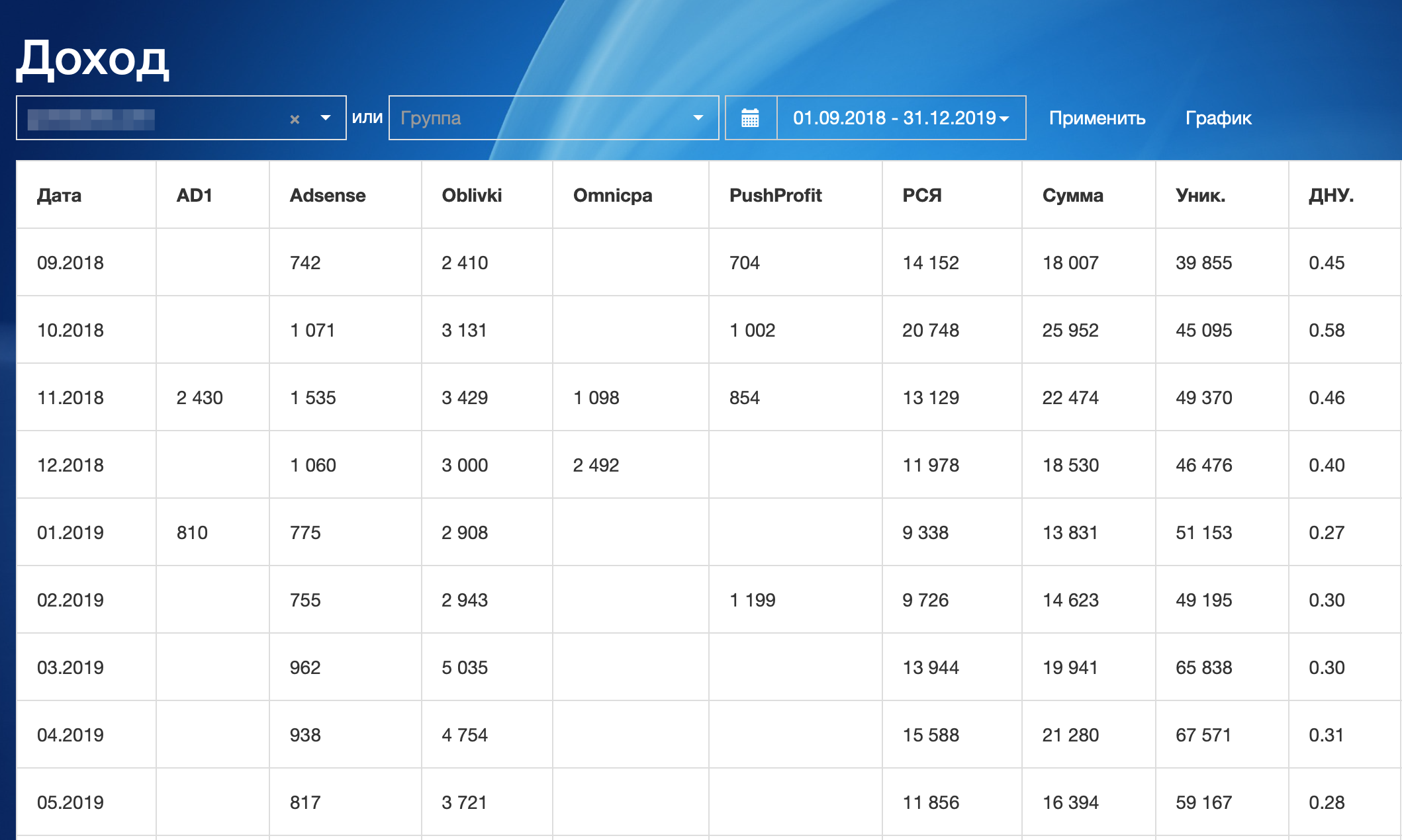 Молодой сайт с растущим трафиком. Монетизация на 15 копеек ниже чем должна быть потому что я ленивая жопа и с Августа 2018 перестал заниматься сайтами, соответственно и доход просел с 42-25 копеек на уника до 28-30. Плюс забил на пуши, а это тоже от 5 до 10 копеек упущенного дохода. Это ваша точка роста.