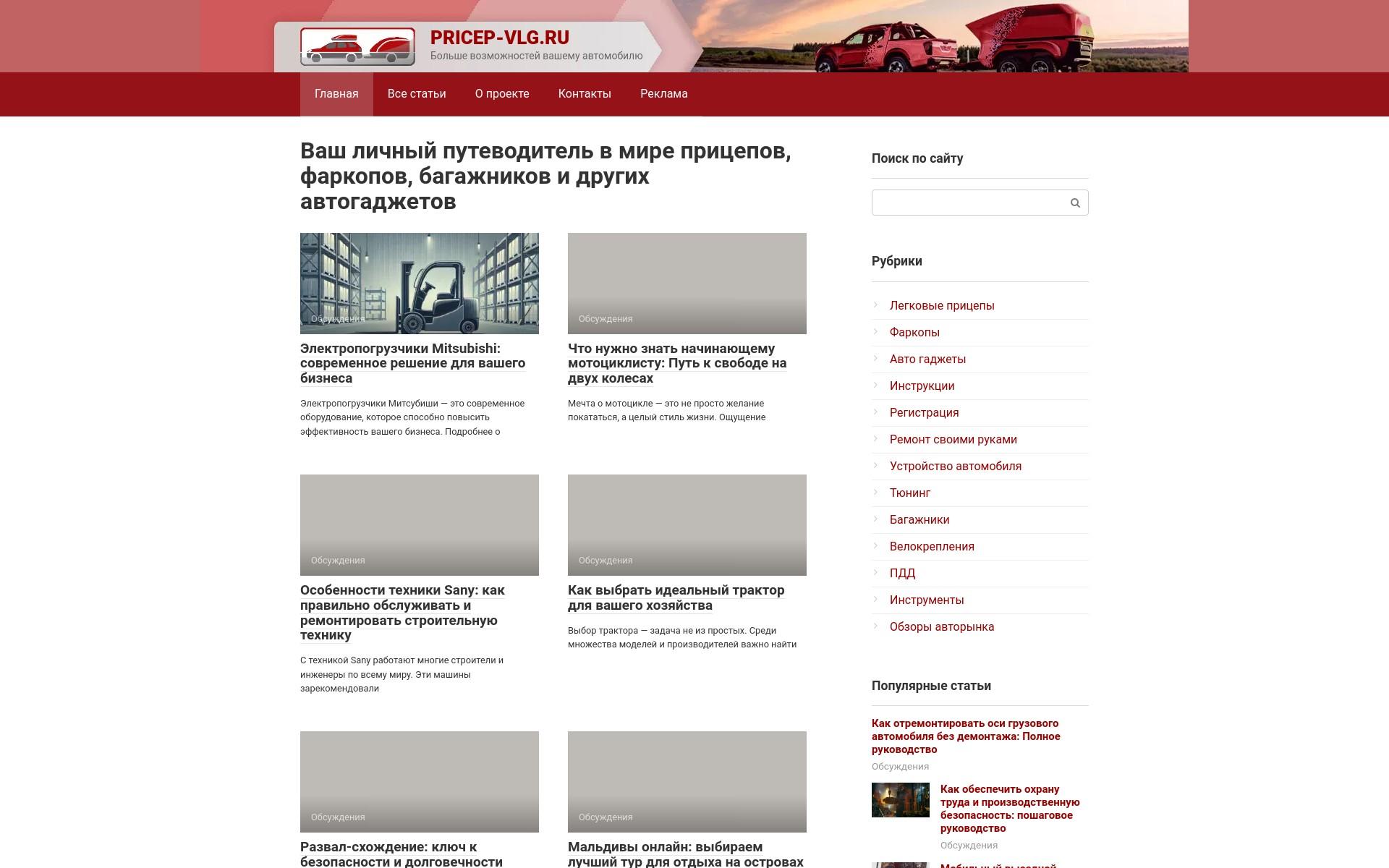 Сайт изначально был заточен на узкую аудиторию - легковые прицепы. Затем, когда тема практически была исчерпана, стали прирастать сопутствующие темы: багажники, фаркопы, автогаджеты, полезные советы и все такое. Все статьи имеют 100% уникальность с тошнотой по слову не более 2,5%. Ключи подбираются исключительно под популярные запросы, много коммерческих. В период раскрутки каждые 1-2 дня на сайте появлялась новая статья, которую моментально пожирают поисковики.