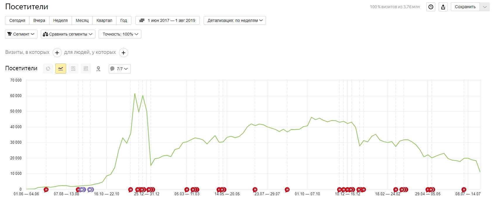 Никогда не было никаких фильтров, что видно на прикрепленных скриншотах (спады только на Новый Год) и в данных метрики (доступ после добавления в отслеживаемые).