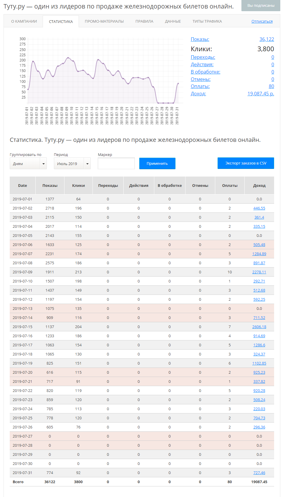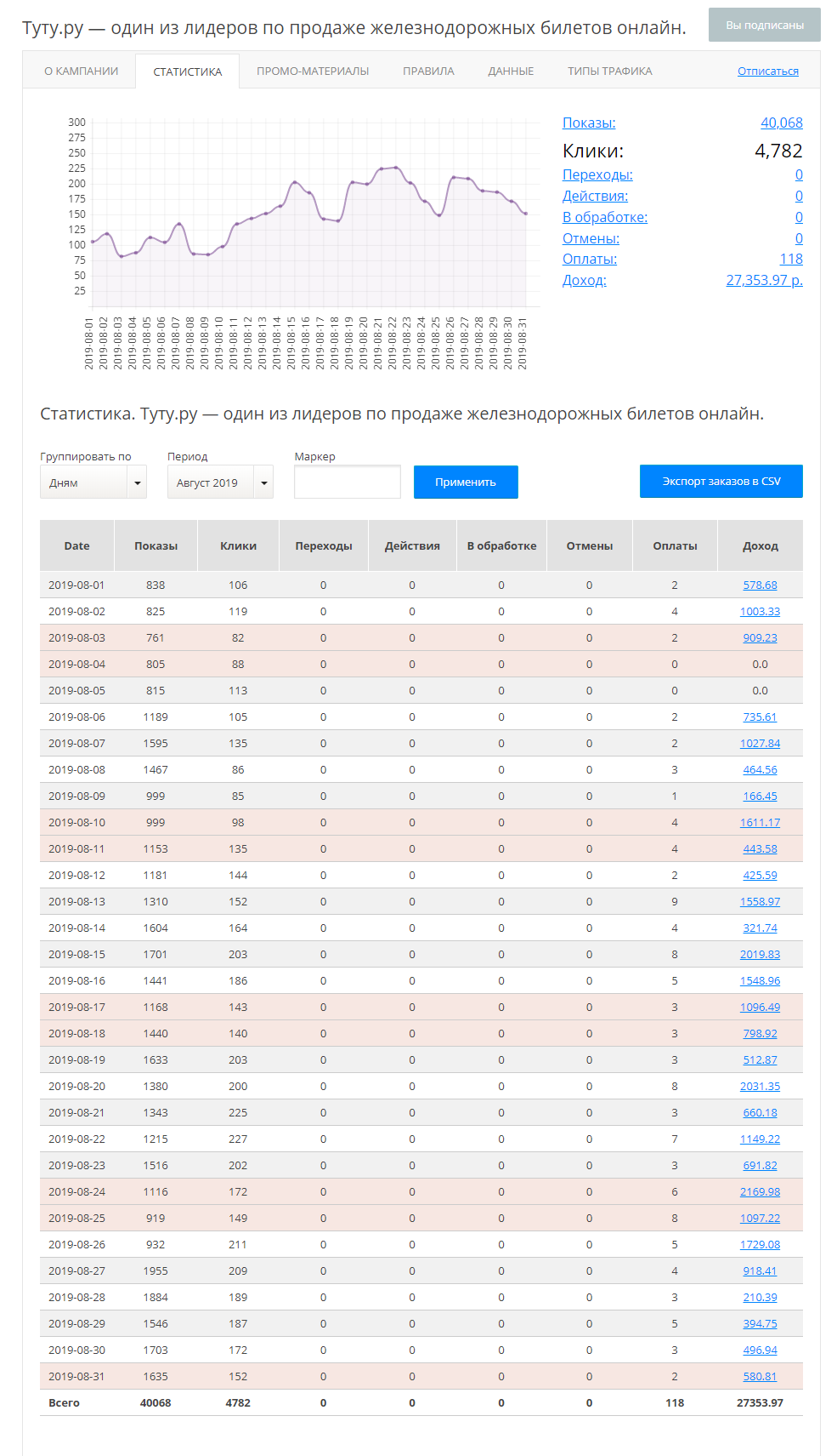 Сайт по продаже ЖД билетов, работаю последние 3 месяца с ТуТу, трафик растет, доход вместе с ним. До этого сайт был на другом домене, после претензий от РЖД переехал на новый, без бренда, старый склеил.