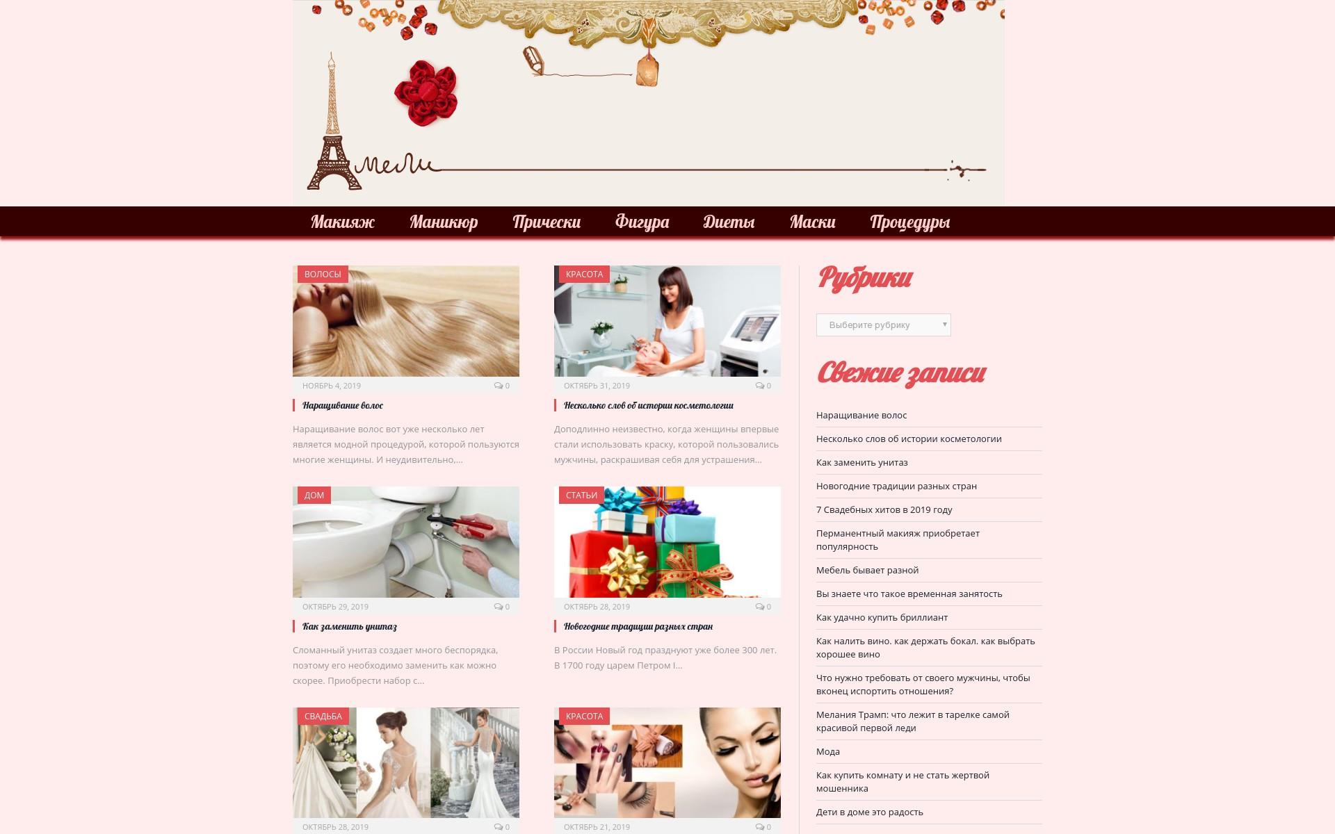 Уголок красоты "Амели". Возможна продажа ниже оптимальной цены, предлагайте свою цену в личку или делайте ставку. Движок сайта - вордпресс (сможет освоить любой, оптимальный для обучения). Добавлен в ГГЛ и Миралинкс, для повышение траста нужно поднять трафик. Шаблон почищен от левых ссылок. Настроены виджеты. Контент уникальный, созданы метки для быстрого поиска информации. Хороший старт для обучения и дальнейшего развития.