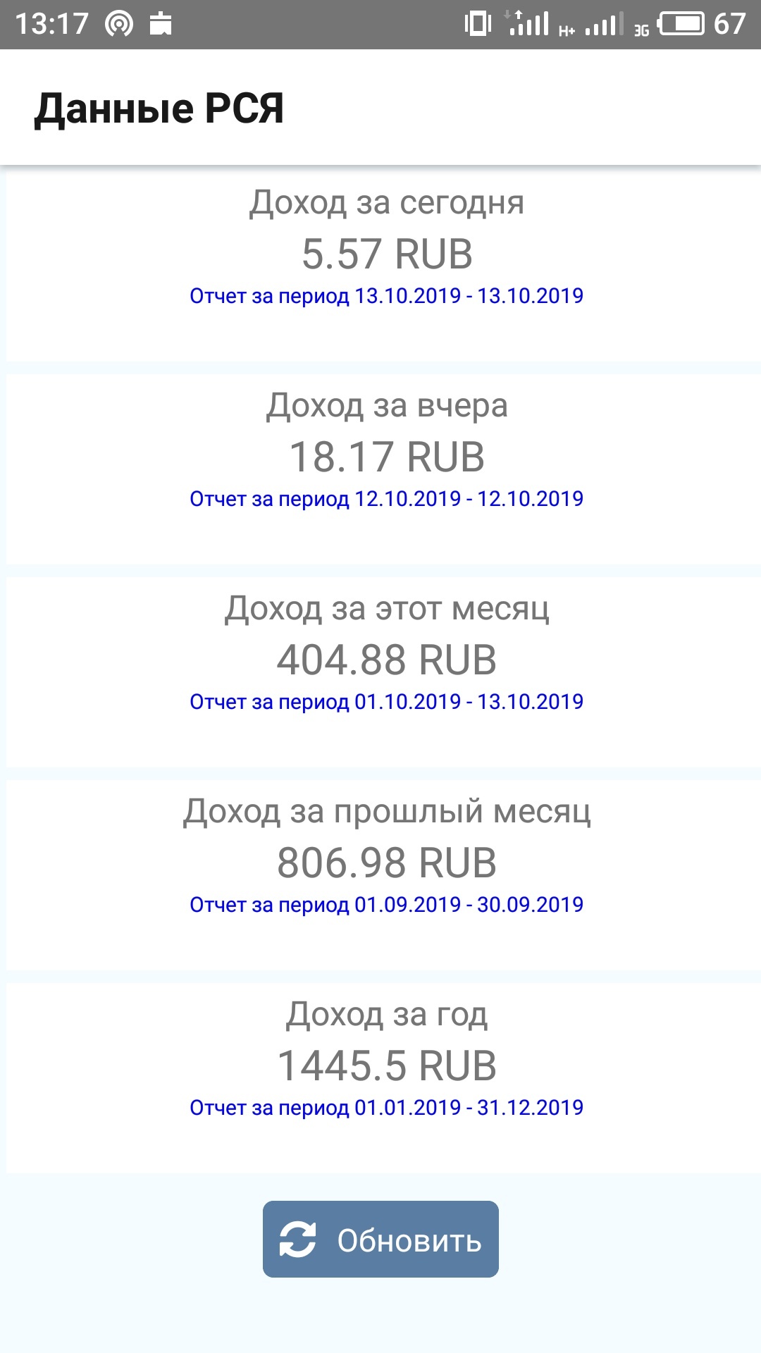 В выходные доход падает, в будни в среднем 40-70 рублей в сутки с рекламы.