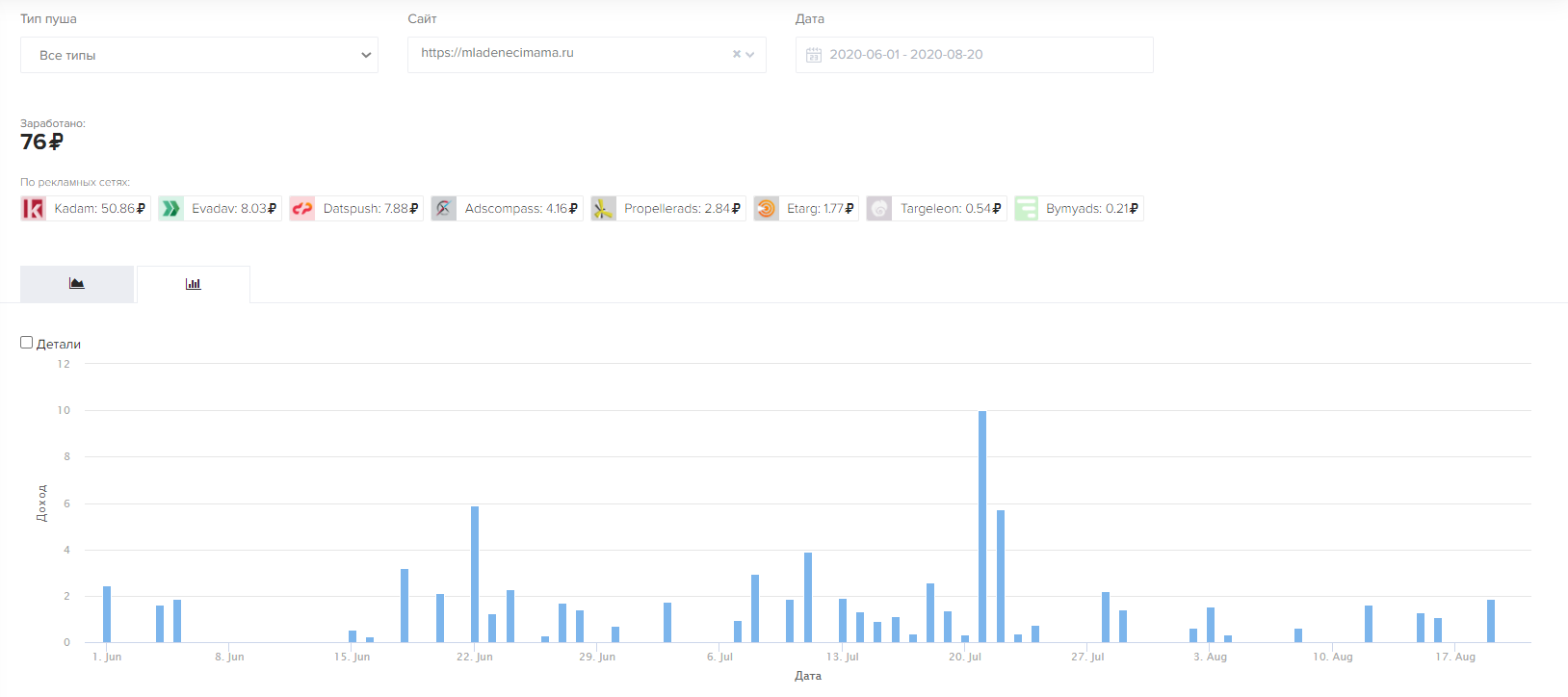 Сайт монетизируется преимущественно РСЯ, также за время собрана база пушей, которая будет передана и будет стабильно приносить доход.