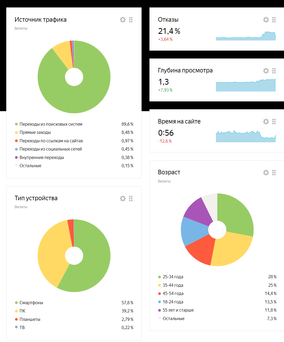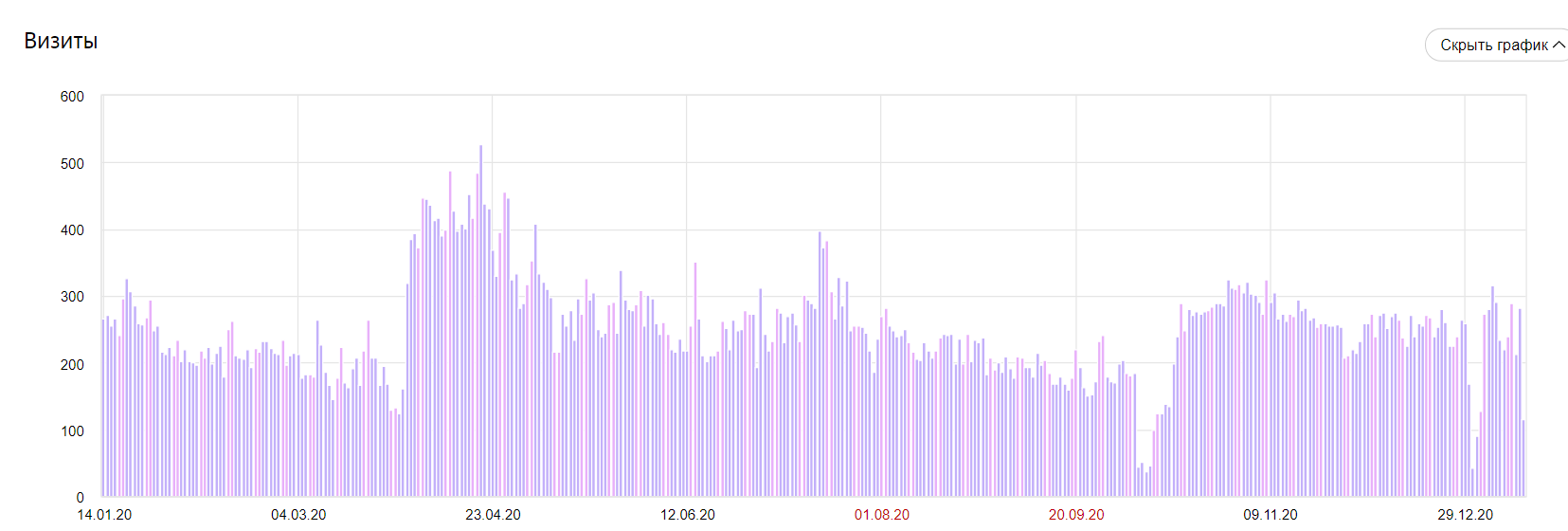 Основной трафик на взрослые информационные темы. Во время карантина был заметный скачок (смотрите на скрине метрики за год).