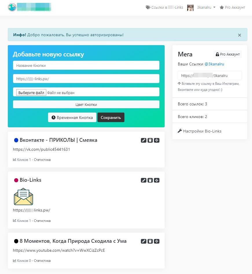 - Эксклюзивные функции Pro Аккаунта (Цветные Кнопки, Значок Проверен, Пиксель Facebook, Сокращение через Bit.ly, Загрузка Фоновой Картинки, Google Аналитика, Запланированные Ссылки).