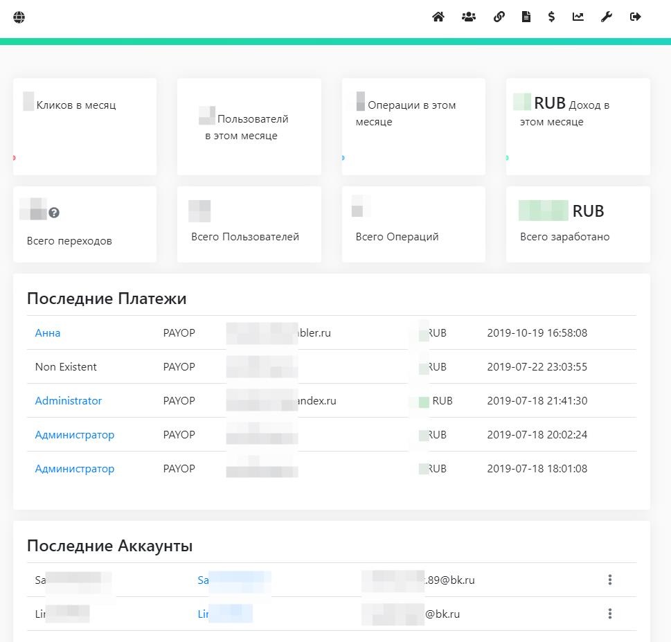 -Статистика по финансам, пользователям, кликам, последним регистрациям.