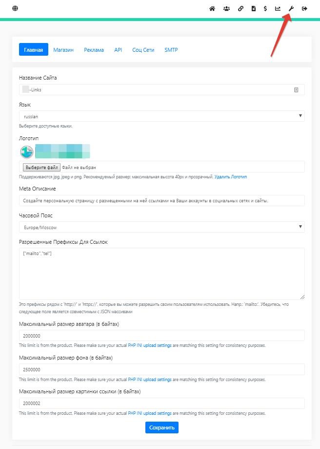 - Настройка названия сайта, Meta Описание, часовой пояс, разрешенные префиксы для ссылок, максимальный размер аватара, максимальный размер фона, максимальный размер картинки ссылки.