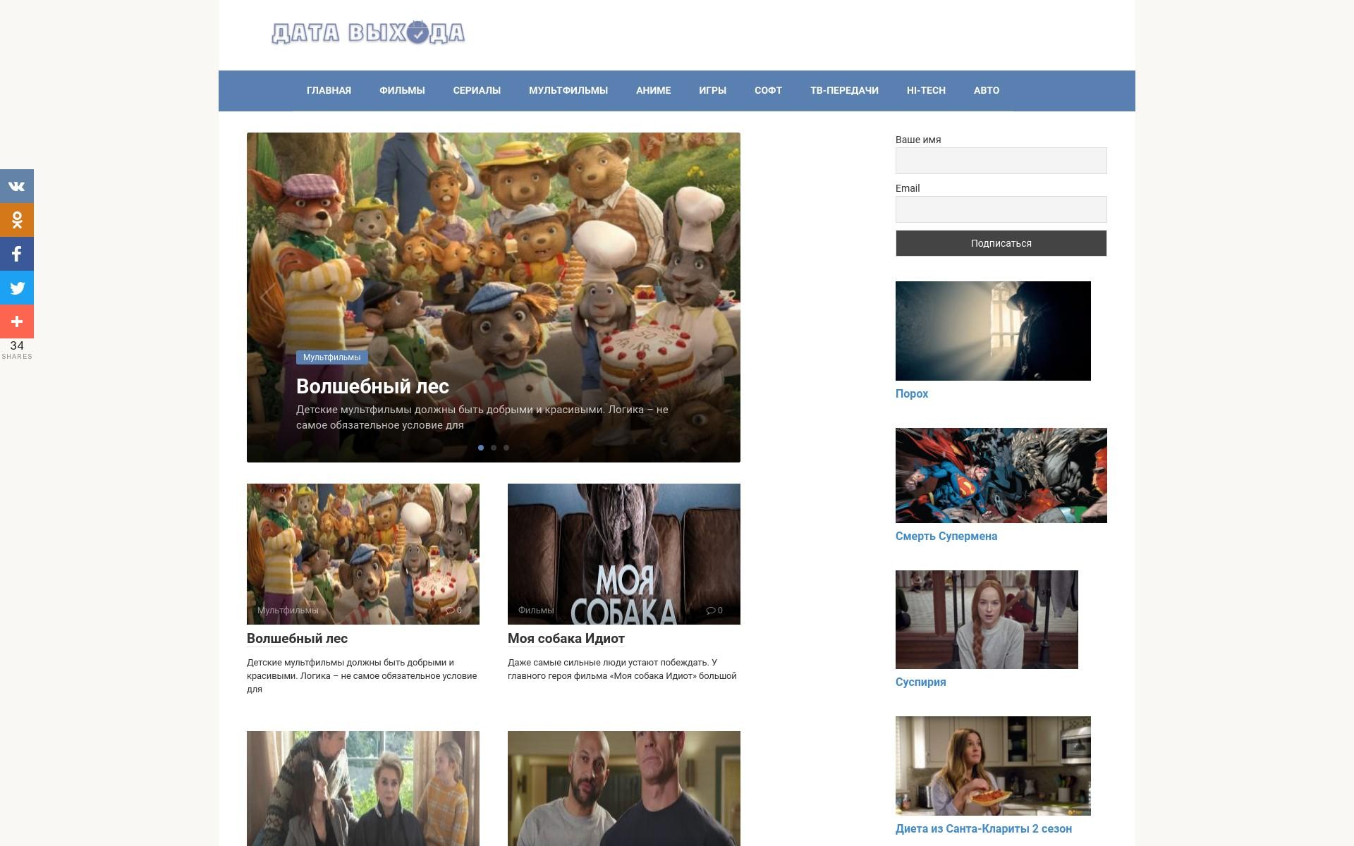 Предлагаю вам на продажу сайт анонсов выхода кино, сериалов, мультфильмов, игр, гаджетов и т.д.. У сайта легкий и приятный дизайн. Уже есть больше 2000 анонсов, 80% контента является уникальным. Для любителей кино индустрии, а также других новостей для проведения досуга этот сайт может стать лучшим другом для хорошего время провождения.