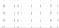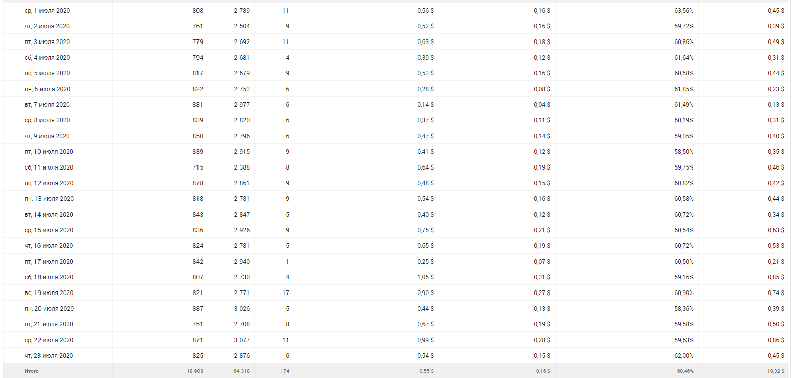 Трафик 800-1000 человек в день. Поведенческие факторы отличные. В среднем:отказы — 8,53 %, глубина просмотра — 1,14, время на сайте — 0:52 минуты. Распределен трафик равномерно, на все статьи, с небольшими ступенями от большего к меньшему, рывков резких в этом плане нет.