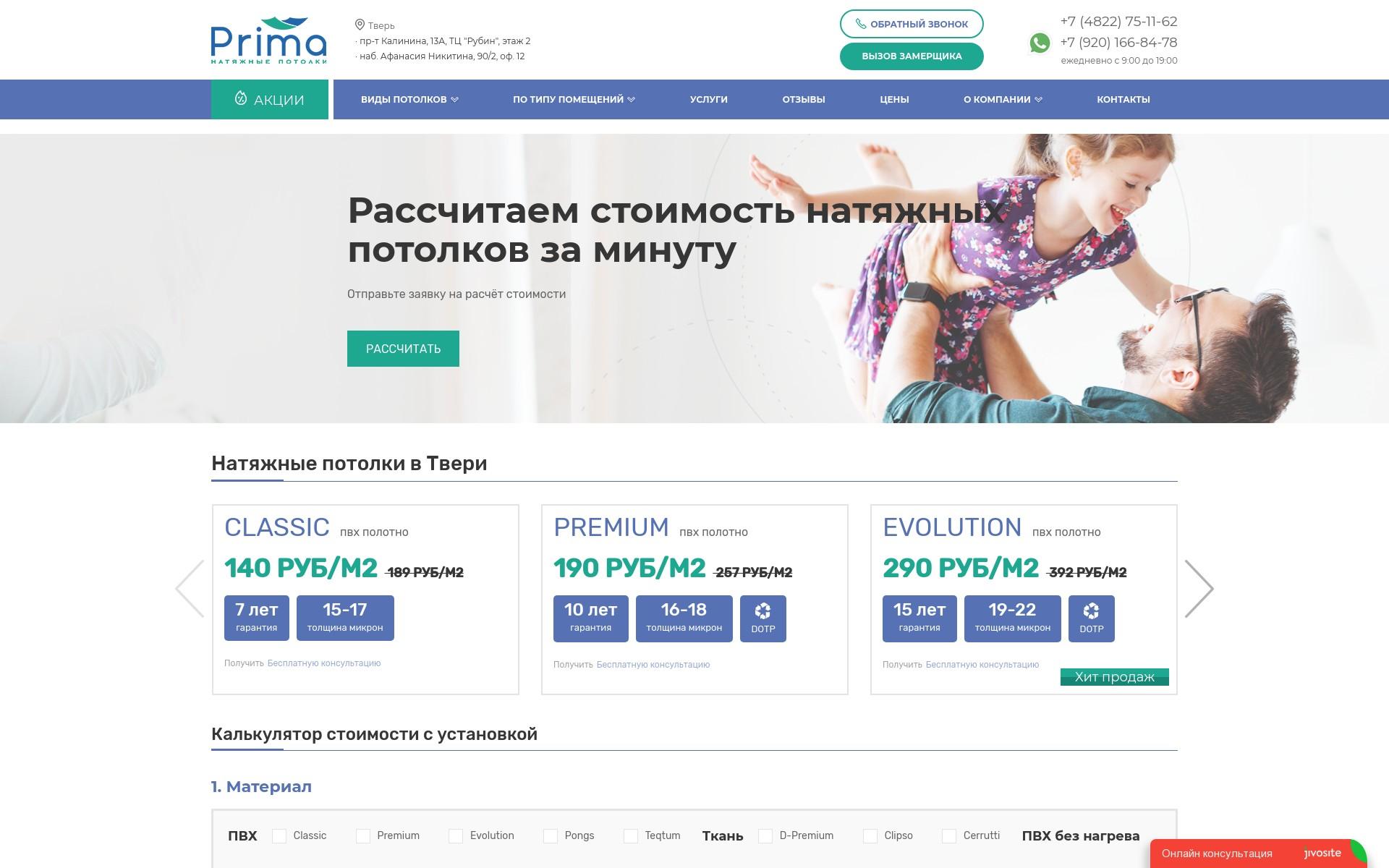 Сайт по продаже натяжных потолков в Твери. Создавался для себя. В подарок покупателю группа ВК 4000 подписчиков, на эту же тематику (75% - Тверские подписчики)