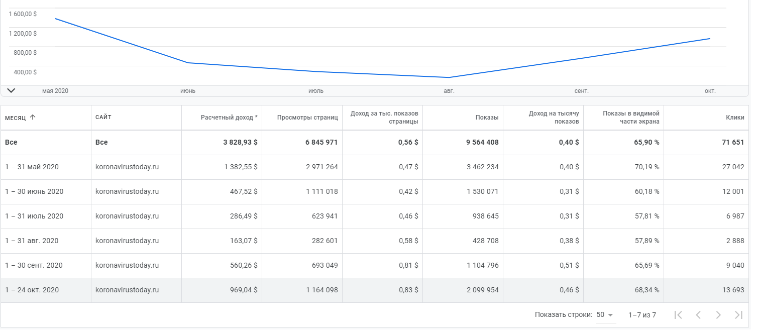 Один из первых сайтов о коронавирусе. Трафик весной был до 120 тыс в сутки, на лето его забросил, сейчас 45 тысяч в сутки в будни. Топы по основным вч запросам.