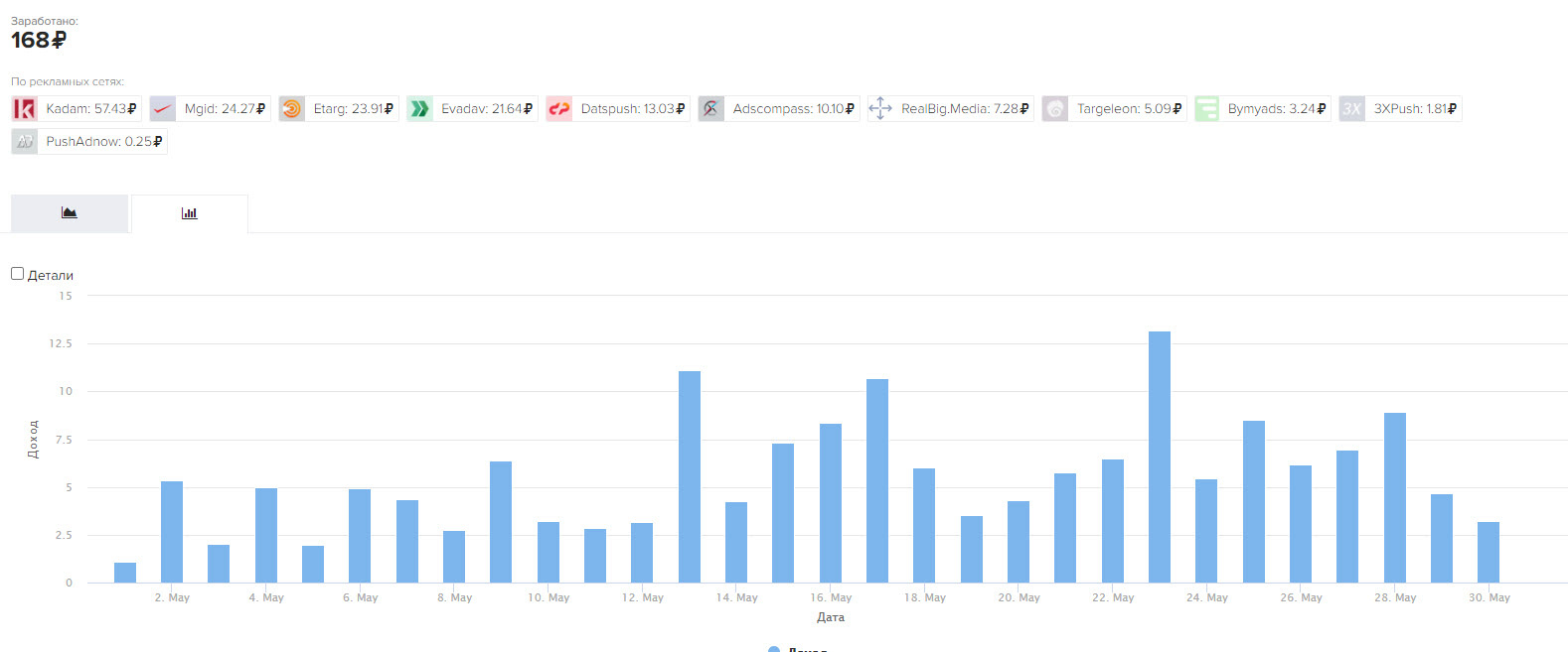 Стоят пуши от RealBig с конца апреля. В мае заработано 168. Все принтскрины приложил.