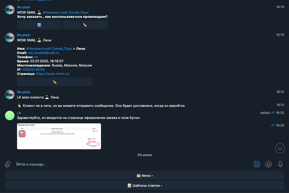 Установлен чат-бот Replain с пересылкой сообщений в Telegram.
