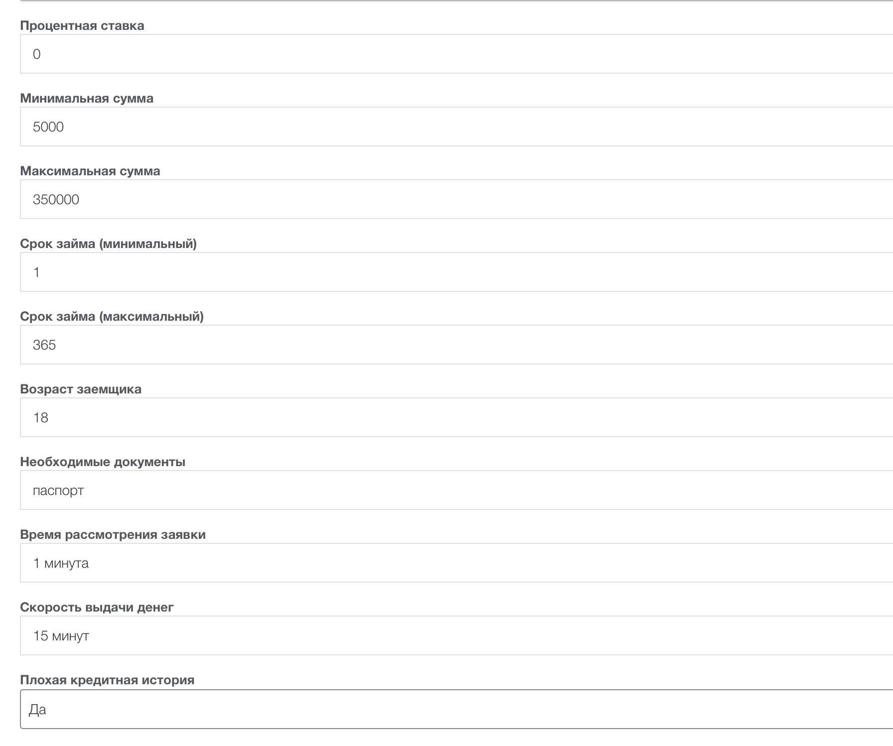 У части МФО есть уникальные тексты с инструкциями и отзывы (заказывал отдельно). Карточки удобно заполняются через админку, все поля уже настроены, вам не придется ничего менять (пример: Заполнение информации в карточке МФО).